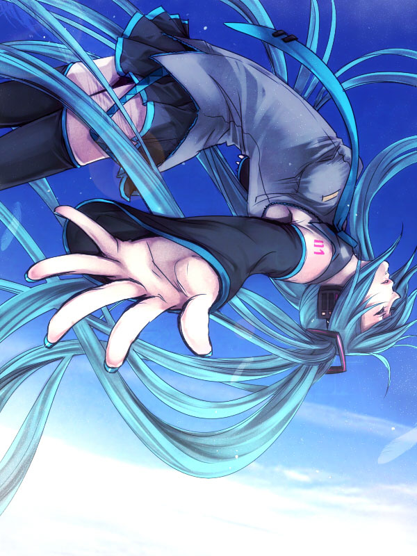 detached sleevesforeshorteninggreen hairheadsetlong hairnecktieskirtskysolothighhighstwintailsvery long hairzettai ryouiki