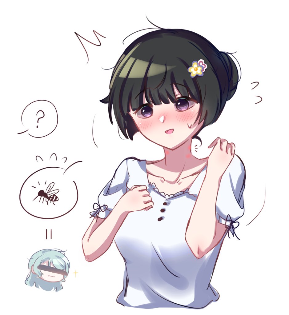 1boy2girlsaqua hairblack hairblushbreastsbugclosed mouthflowerhickeyinsectlarge breastslong hairmosquitomultiple girlsnose blushopen mouthpurple eyesshirtsimple backgroundwhite backgroundwhite flowerwhite shirtyellow floweryuri