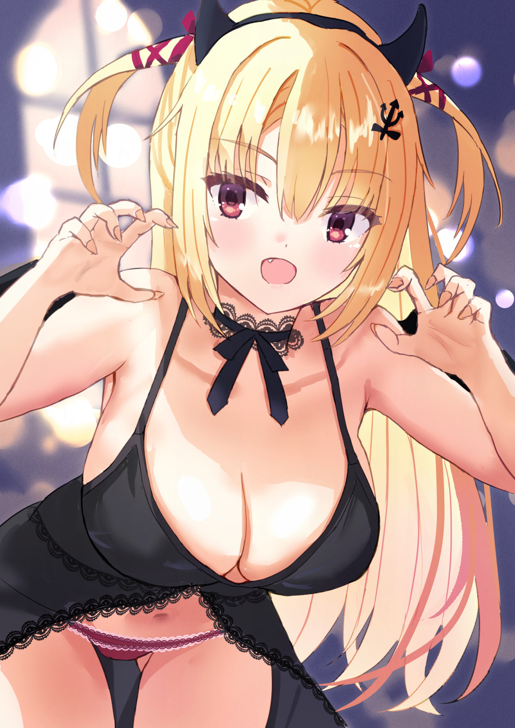 :d1girlalternate costumebabydollbare shouldersblack babydollblack hairbandblack ribbonblonde hairblurryblurry backgroundblushbreastsclaw posecleavagecollarbonecowboy shotdemon hornsdemon wingseyes visible through hairfake hornsfake wingsfangfingernailsforeshorteninggluteal foldhair between eyeshair ribbonhairbandhalloweenhalloween costumehands uphorn hairbandhornsindoorslacelace trimlace-trimmed babydolllace-trimmed pantieslarge breastsleaning forwardlingerielong hairlooking at viewernavelneck ribbonopen mouthpantiesred eyesred pantiesred ribbonribbonsharp fingernailssidelightingsidelockssmilesolotwo side upunderwearvery long hairwings