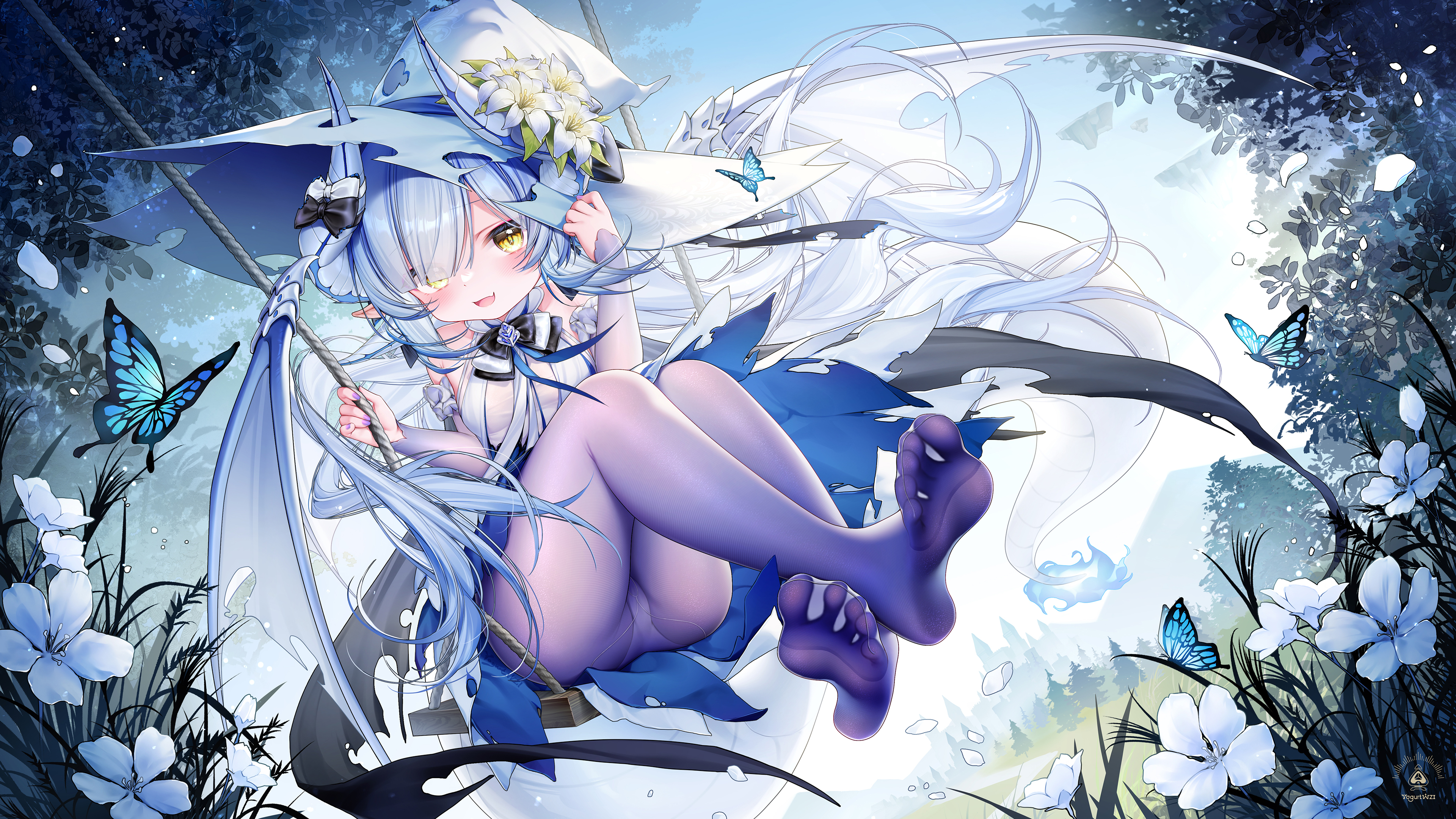 1girlbare shouldersblue hairbugbutterflydragon girldragon hornsdragon wingselbow glovesfeetflowerfull bodygloveshornsinsectlong hairlooking at viewerno shoespantiespanties under pantyhosepantyhosepointy earssolesthighsunderwearwingsyellow eyes
