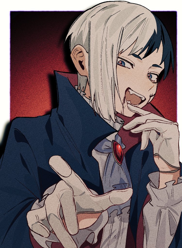 1boyascotblack capeblack hairbloodblood from mouthblue eyescapefangsgloveslong sleeveslooking at viewermale focusmulticolored hairopen mouthred backgroundshirtshort hairsmilesolosplit-color hairtwo-tone hairupper bodyvampirevampire costumewhite ascotwhite gloveswhite hairwhite shirt