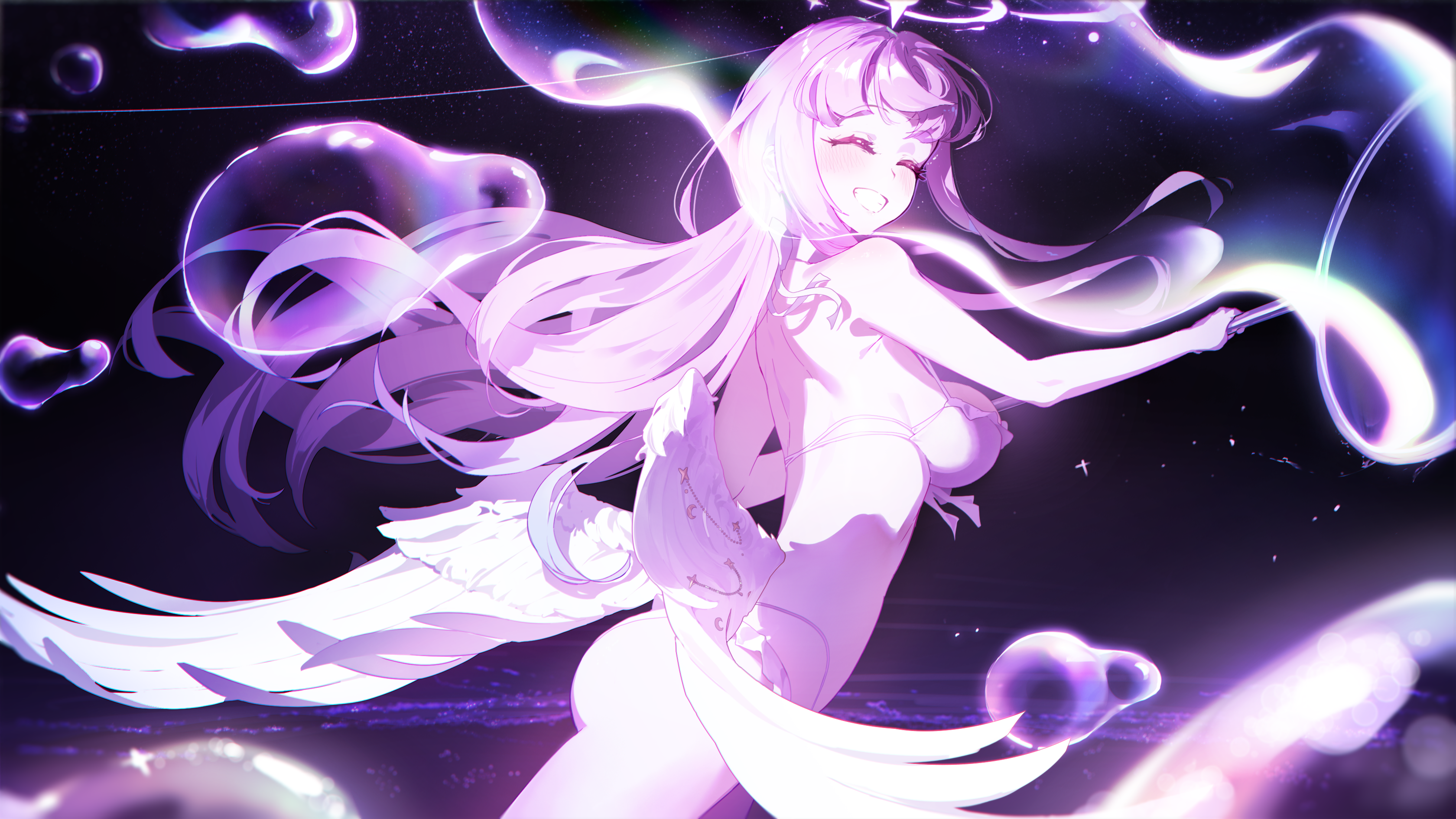 1girlangel wingsbikinibreastsclosed eyesfeathered wingsfrilled bikinifrillshalolong hairlow wingsmedium breastsofficial alternate costumeofficial alternate hairstyleopen mouthpink hairpink halosmilesoloswimsuitvery long hairwhite bikiniwhite wingswings