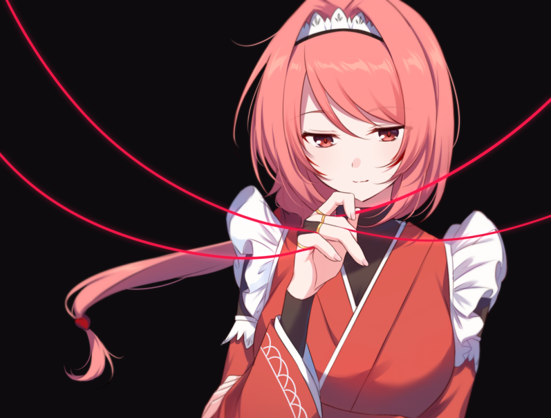 1girlblack backgroundclosed mouthfrilled kimonofrillshair intakeshand upjapanese clothesjewelrykimonolight smilelong hairlong sleeveslooking at viewerlow ponytailmaidmaid headdresspink hairponytailred eyesred kimonoringsmilesolostringstring of fateswept bangsupper bodywa maidwide sleeves