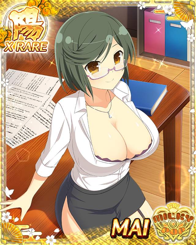 1girlbinderblack hairbookbookshelfborderbrabra peekbreastsbrown eyesbusiness suitcard (medium)cleavageclosed mouthdeskformal clothesgarter strapsglasseslarge breastslight smilelooking at viewerofficeoffice ladyofficial alternate costumeon deskpencil skirtshirt tucked inshort hairsittingskirtskirt suitsolosuitswept bangsunderwear