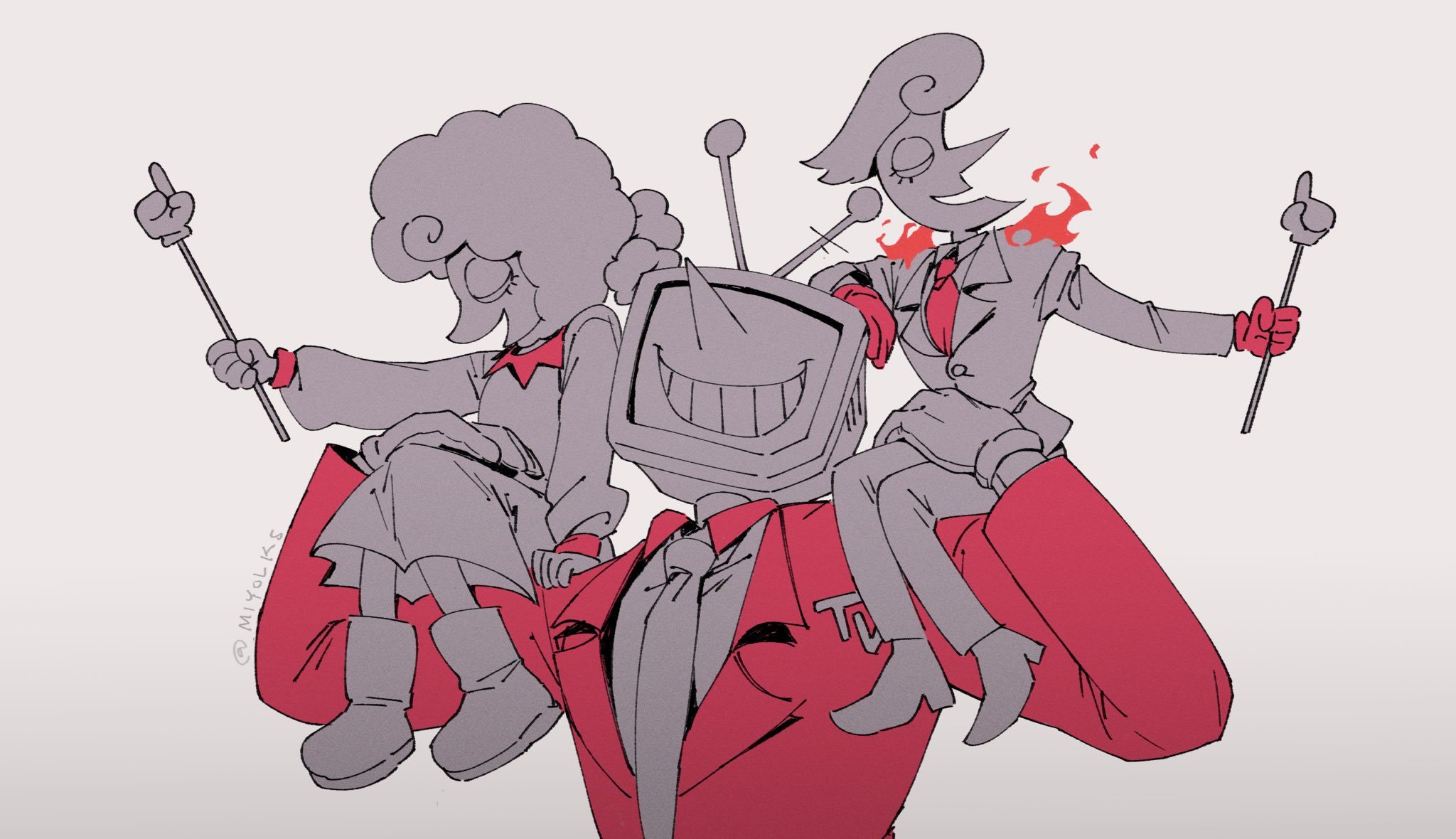 1girl2boysbootscarryingclosed eyescollared shirtcrtdressfireglovesgrey backgroundholdingholding pointerjacketlong nosemiyolksmultiple boysnecktieobject headpantspointerpointy noseradio antennared glovesred jacketred necktieshirtshort hairshoulder carrysimple backgroundsize differencespot color