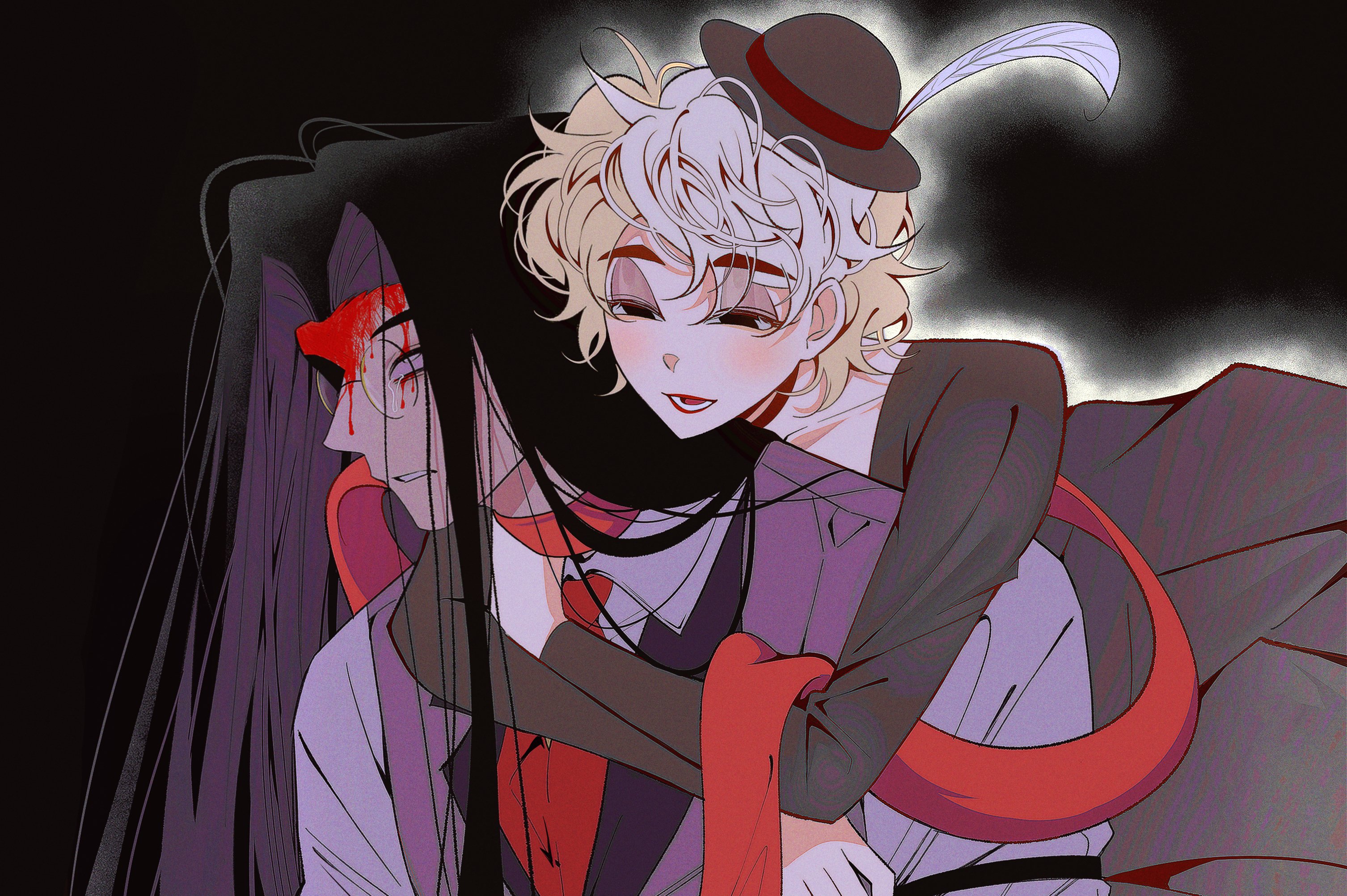 1boy1girlblack dressblack eyesblack hairblonde hairbloodblood on facecollarbonecollared shirtdressglassesgrey hatgrey vesthathughug from behindlong hairneckerchiefparted lipsred neckerchiefred scarfround eyewearscarfshirtshort hairsmiletearsvestwhite shirt
