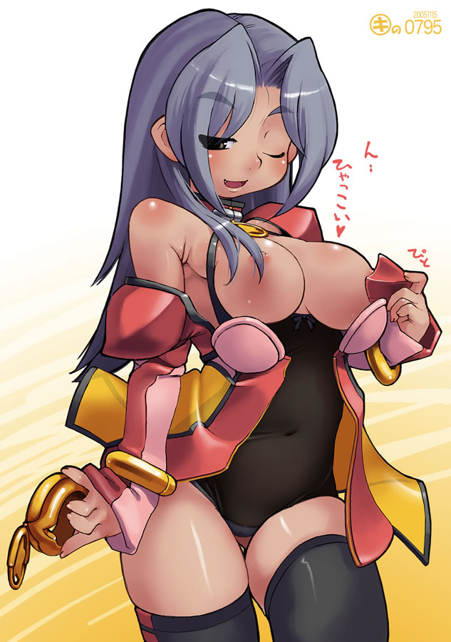 1girlblack thighhighsblue hairbraceletbreastscensoredconvenient censoringdark skindark-skinned femaledetached sleevesfangfemale focusgrey eyeshair over breastsjewelrynaughty facenipplesoff shoulderone eye closedsolothighhighsundressingwink
