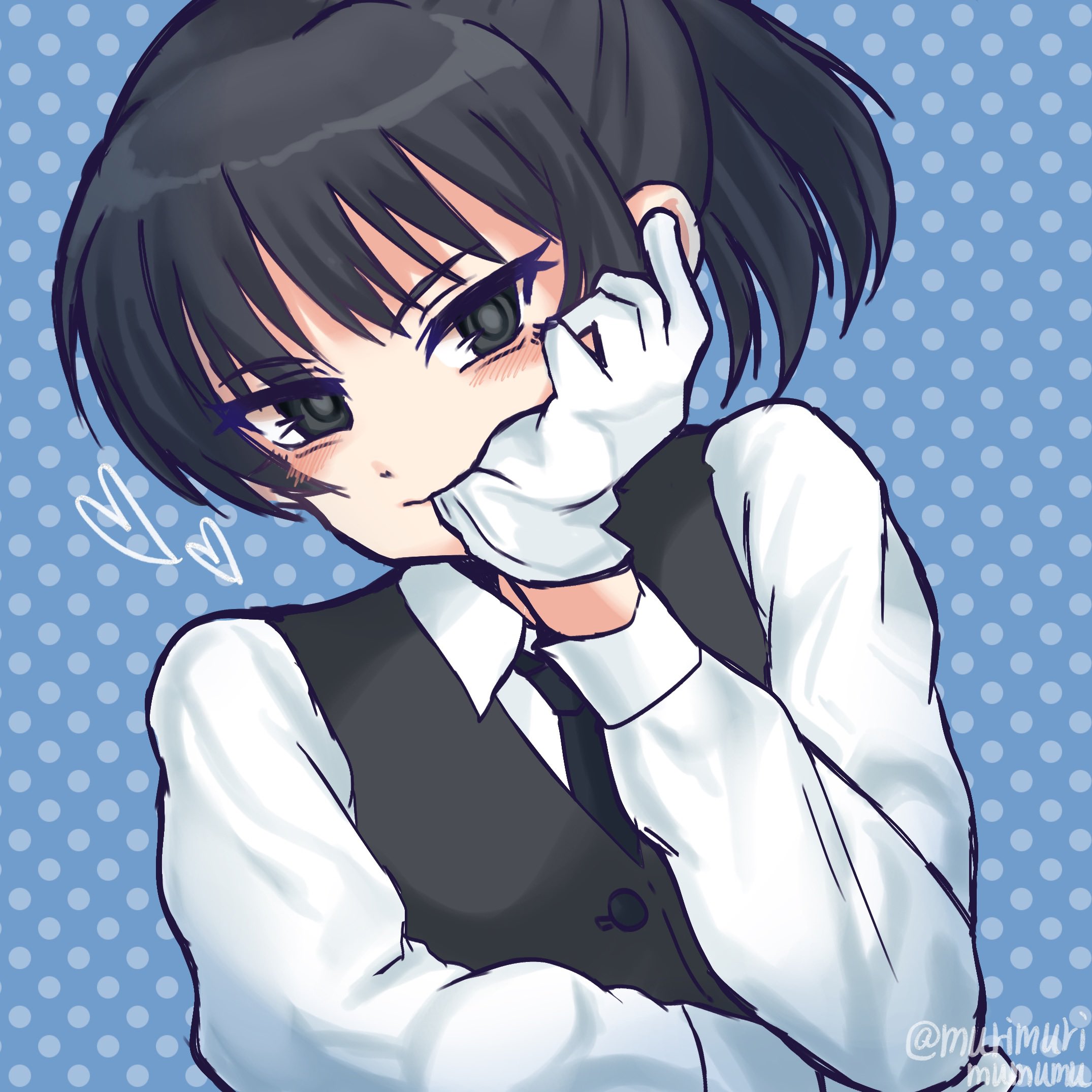 1girlalternate costumebitingbiting gloveblack eyesblack hairblack necktieblack vestblue backgroundblushglovesheartlooking at viewernecktienununu (murimurimumumu)polka dotpolka dot backgroundponytailshirtshort hairsolotwitter usernameupper bodyvestwhite gloveswhite shirt