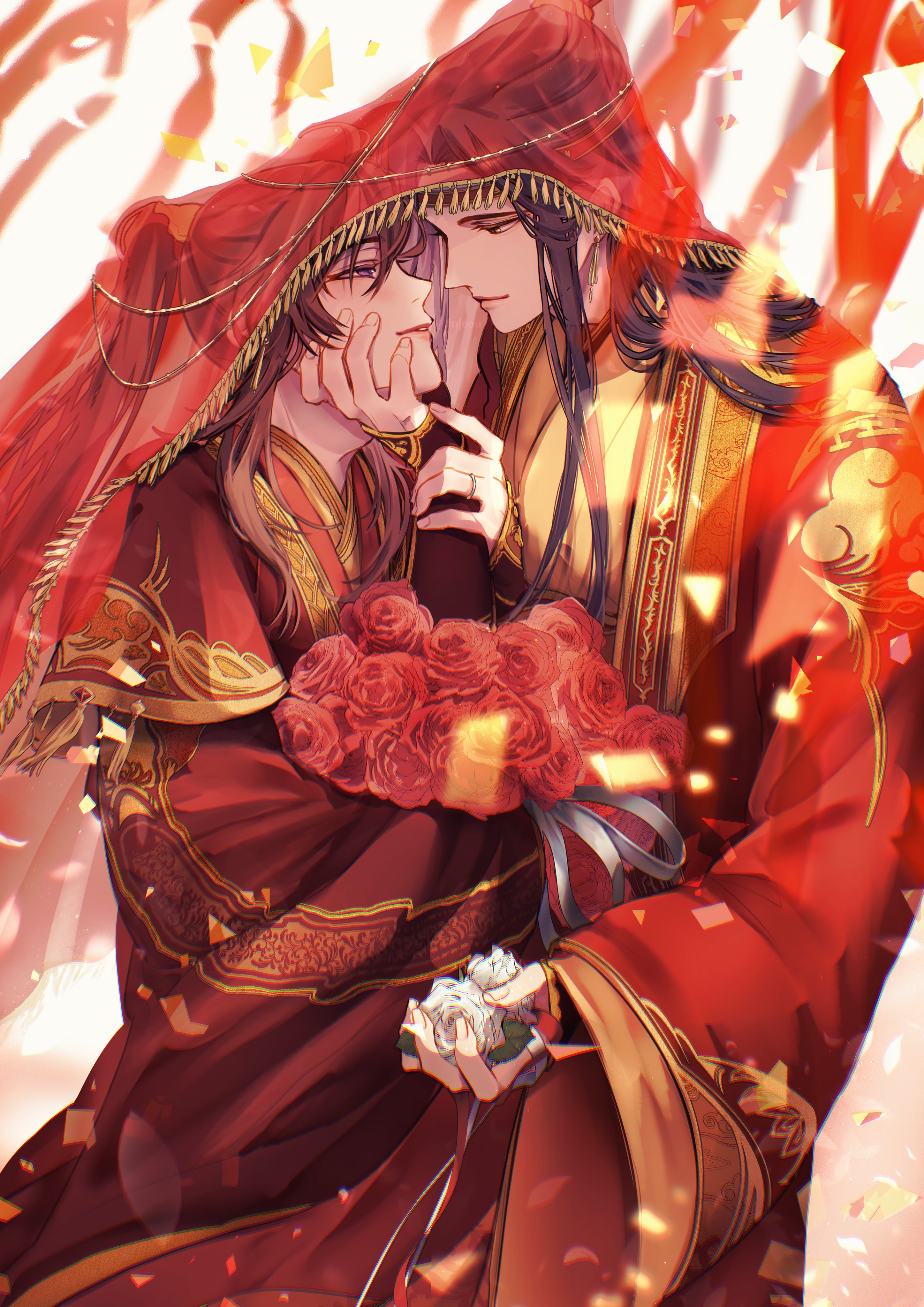 2boysalternate costumeblack hairblurrybouquetbrown hairchinese clotheschinese weddingclosed eyesclosed mouthconfetticoupledressearringseye contactflowerhand on another's cheekhand on another's facehanfuholdingholding another's wristholding bouquetholding flowerhonggaitouimminent kissjewelrylong hairlong sleeveslooking at anothermale focusmultiple boysparted lipspetalsponytailprofilepurple eyesred flowerred hanfured ribbonred rosered veilribbonringroberoseshared veilsidelockssleeves past wristssmilestandingtasseltinjeoutopknotupper bodyveilwedding dresswedding ringwhite backgroundwhite flowerwhite ribbonwide sleevesyaoi