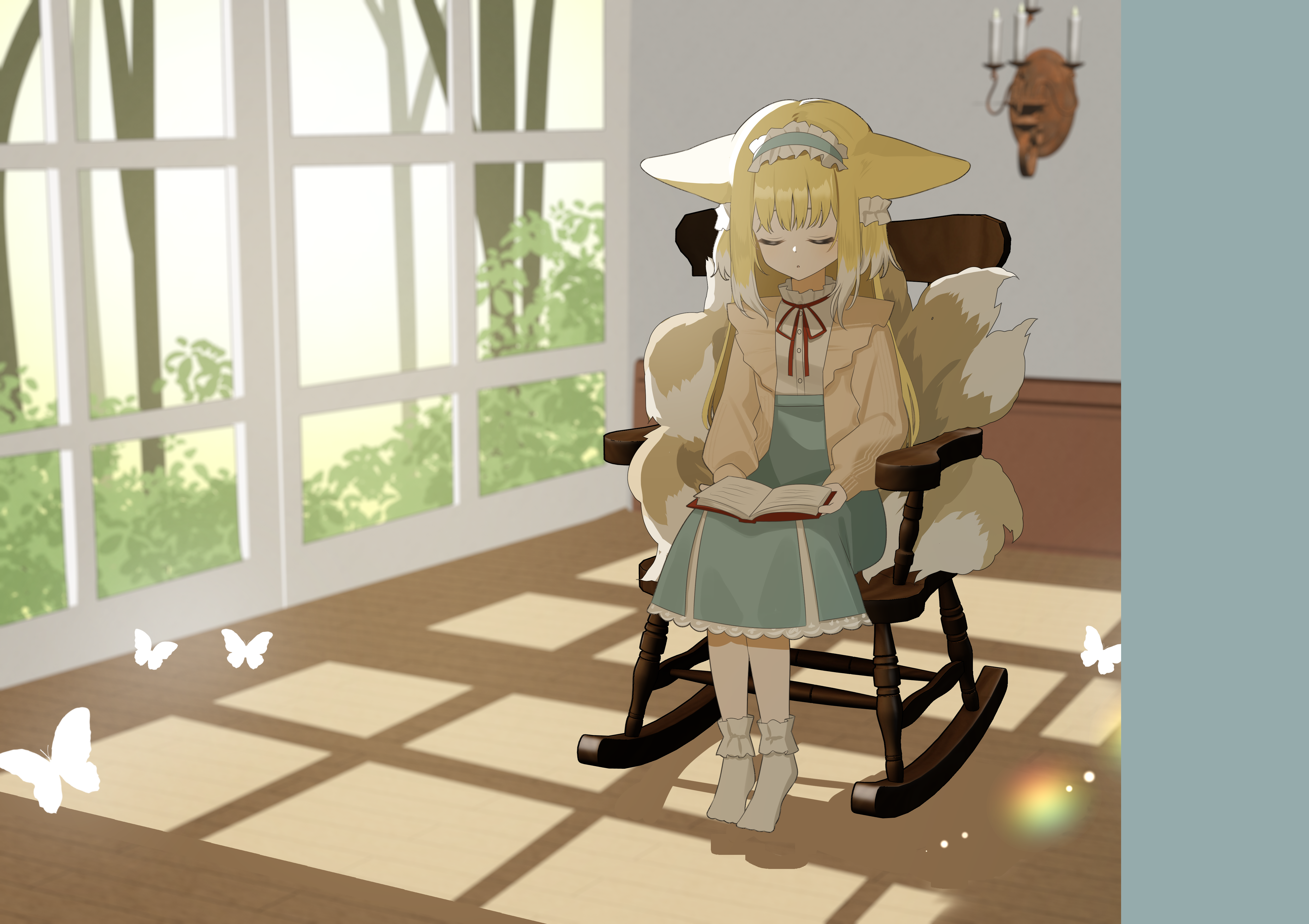 1girlanimal earsblonde hairbookbugcardiganclosed eyescross-laced clothescross-laced skirtfox earsfox girlfox tailfrilled hairbandfrillshairbandkitsunelong hairlong sleevesneck ribbonofficial alternate costumeopen cardiganopen clothesred ribbonribbonsittingskirtsockssolotailyellow cardigan