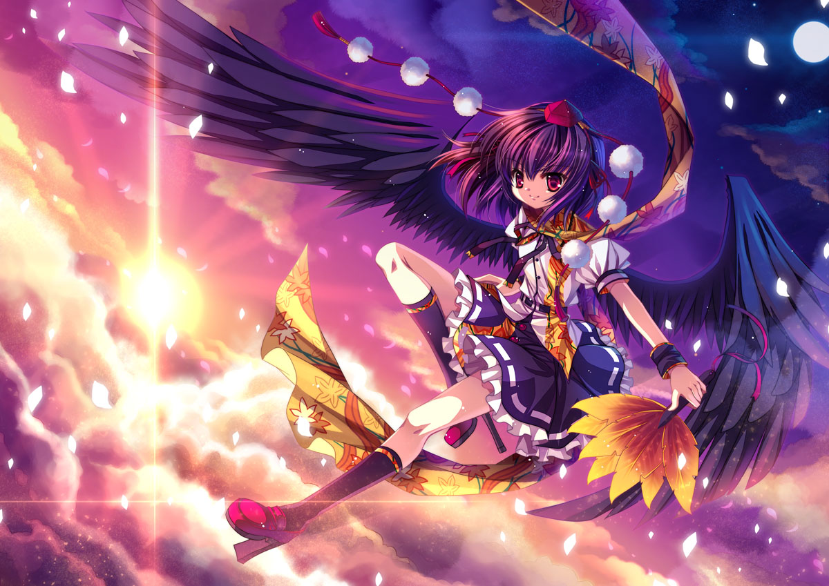 1girlblack hairblack wingscloudfemale focusflyinggetahand fanhatlooking at viewerred eyesshort hairskirtskysolotengu-getatokin hattwilightwings