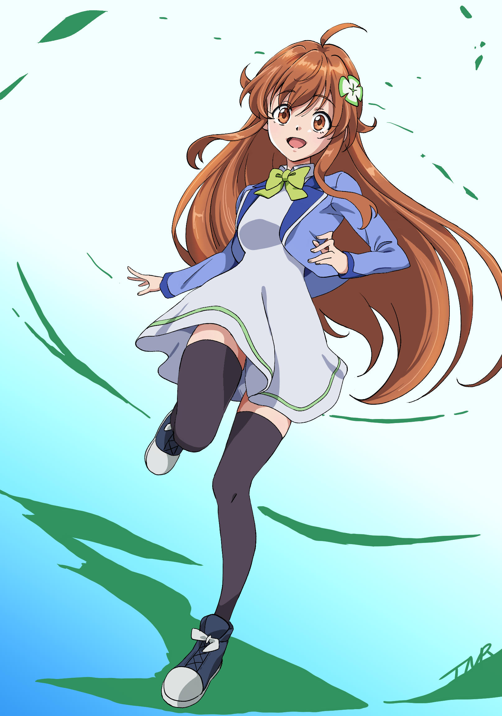 1girlahogeblack thighhighsblazerblue jacketbowbowtiebrown eyesbrown hairclover hair ornamentdressgreen bowgreen bowtiehair ornamentjacketlong hairopen clothesopen jacketopen mouthshoessolostandingstanding on one legthighhighstmr mshowhite dress