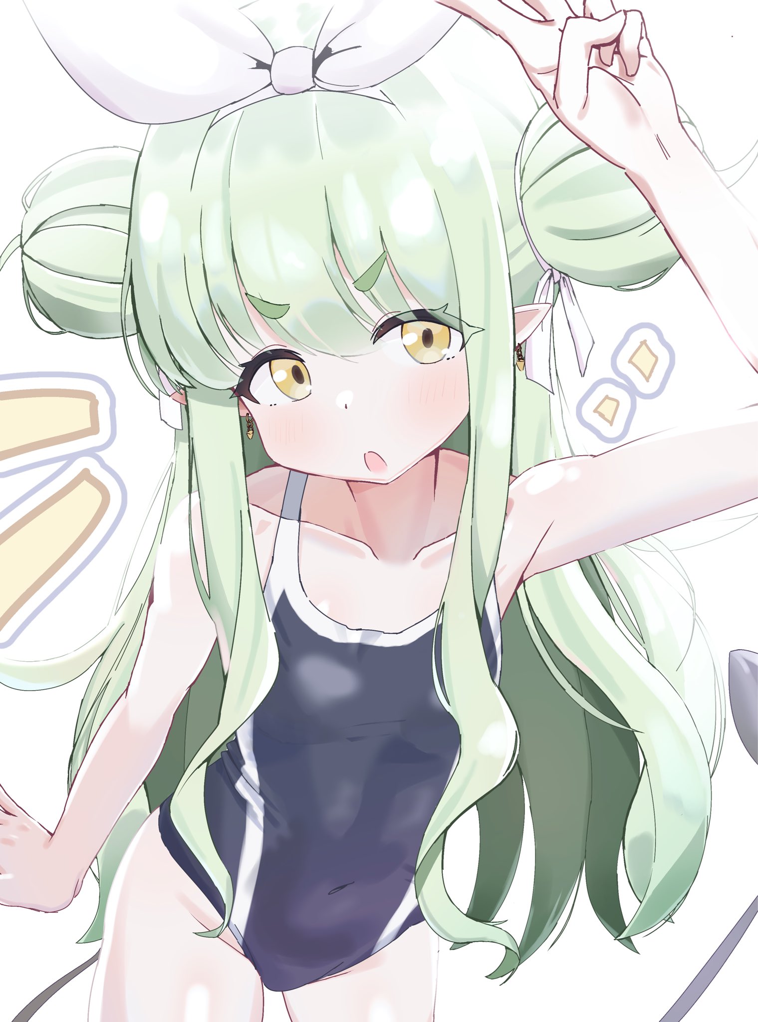 1girlalternate costumearm upblue one-piece swimsuitbreastscovered naveldemon taildouble bunearringsgreen hairhair bunhair ribbonjewelrylong hairone-piece swimsuitopen mouthotintinsukidesupointy earsribbonsmall breastssolostandingswimsuittailvwhite backgroundwhite ribbonyellow eyes