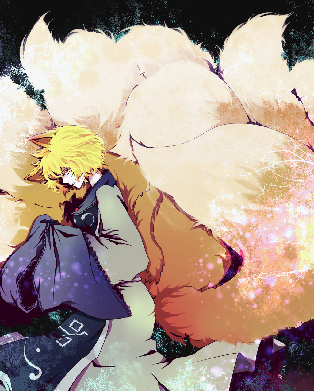 1girlanimal earsblack backgroundblonde hairdressfangfemale focusfox earslong sleevesmultiple tailsno headwearshort hairsolotabardtailwhite dresswide sleevesyellow eyes