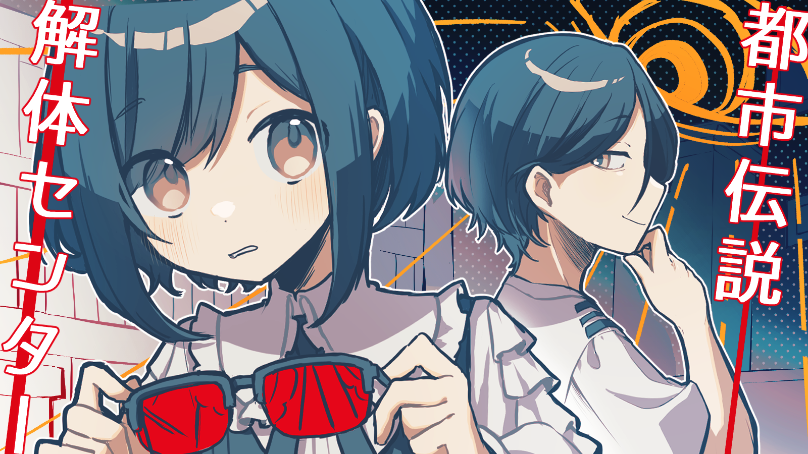 1boy1girlblue hairclosed mouthcollared shirtcopyright namedisembodied eyefrilled shirtfrilled sleevesfrillsglasseshair between eyeshand on own chinhands upholdingholding removed eyewearlimited palettelooking at viewerprofileshirtshort hairsmileswept bangsunworn eyewearupper body