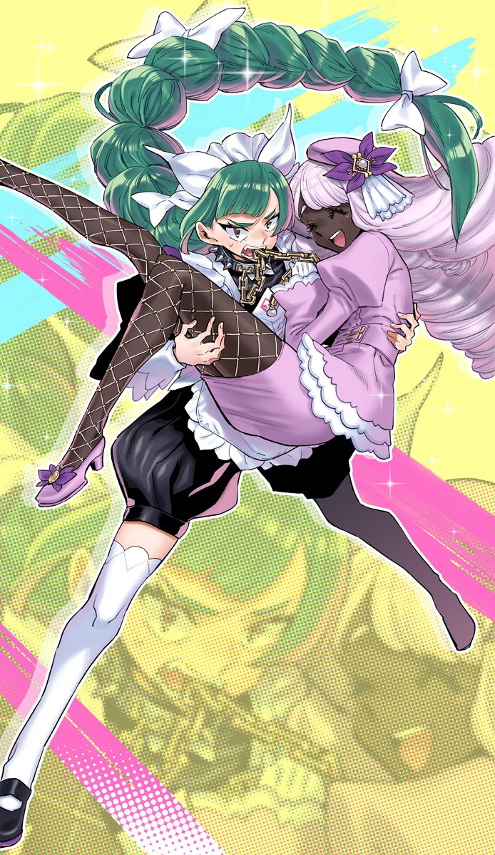 1boy2girlsapronascotcenter frillschainchain leashclosed eyescollardark skindark-skinned femaledifferent zoom layerdressfascinatorfrilled ascotfrillsglovesgreen hairhand on another's backhand on another's shoulderholdingholding chainholding leashjuliet sleevesleashlong hairlong sleevesmaidmaid apronmaid headdressmetal collarmultiple girlsopen mouthpuffy sleevespurple dresspurple hairsmilesweatdropteethvery dark skinwhite glovesyurizoom layer