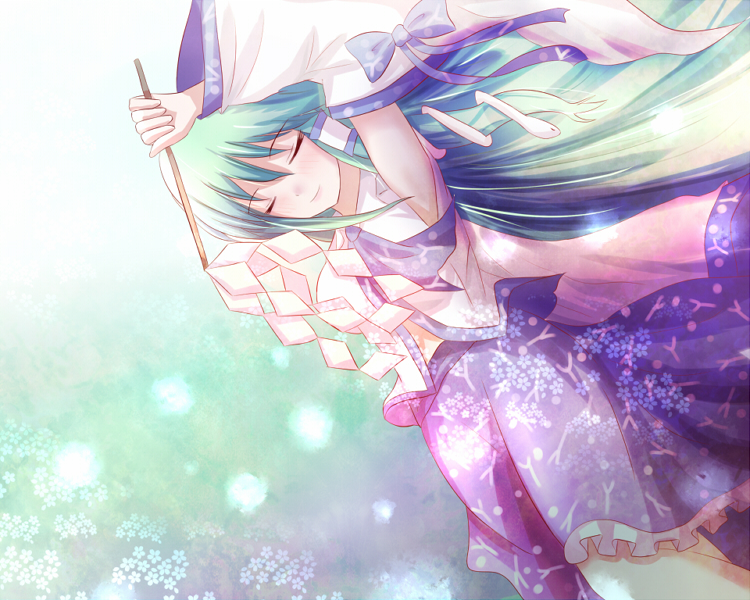 1girlarmpitsclosed eyesdetached sleevesfemale focusgoheigradient backgroundgreen hairlong hairsolowhite backgroundwind