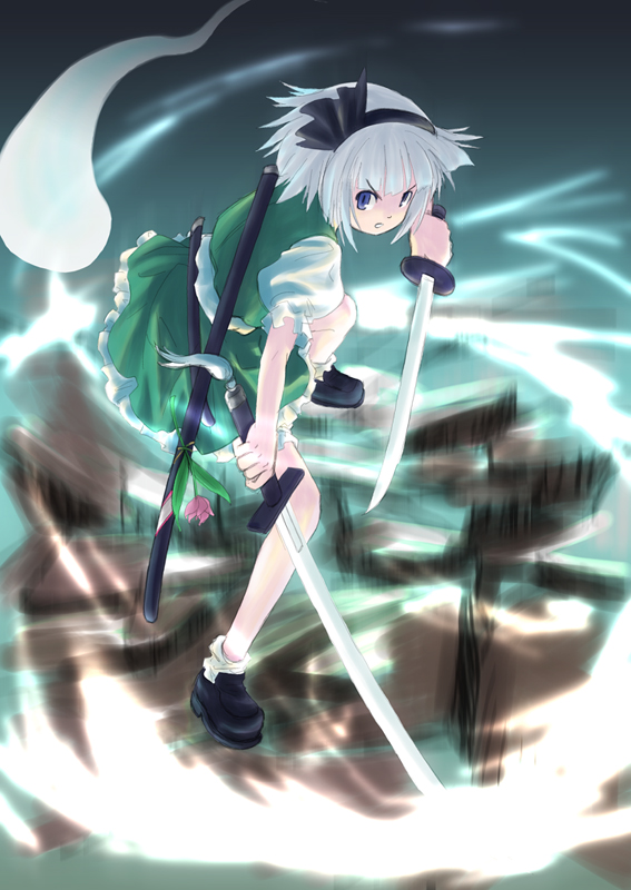 :o1girlblue eyesblunt bangsbob cutbowdual wieldingfemale focusfighting stancefull bodyglowinghair bowhairbandhitodamaholdingkatanaloaferslooking at viewersheathshoesshort hairskirtskirt setsockssolostandingswordv-shaped eyebrowsweaponwhite hairwhite socks