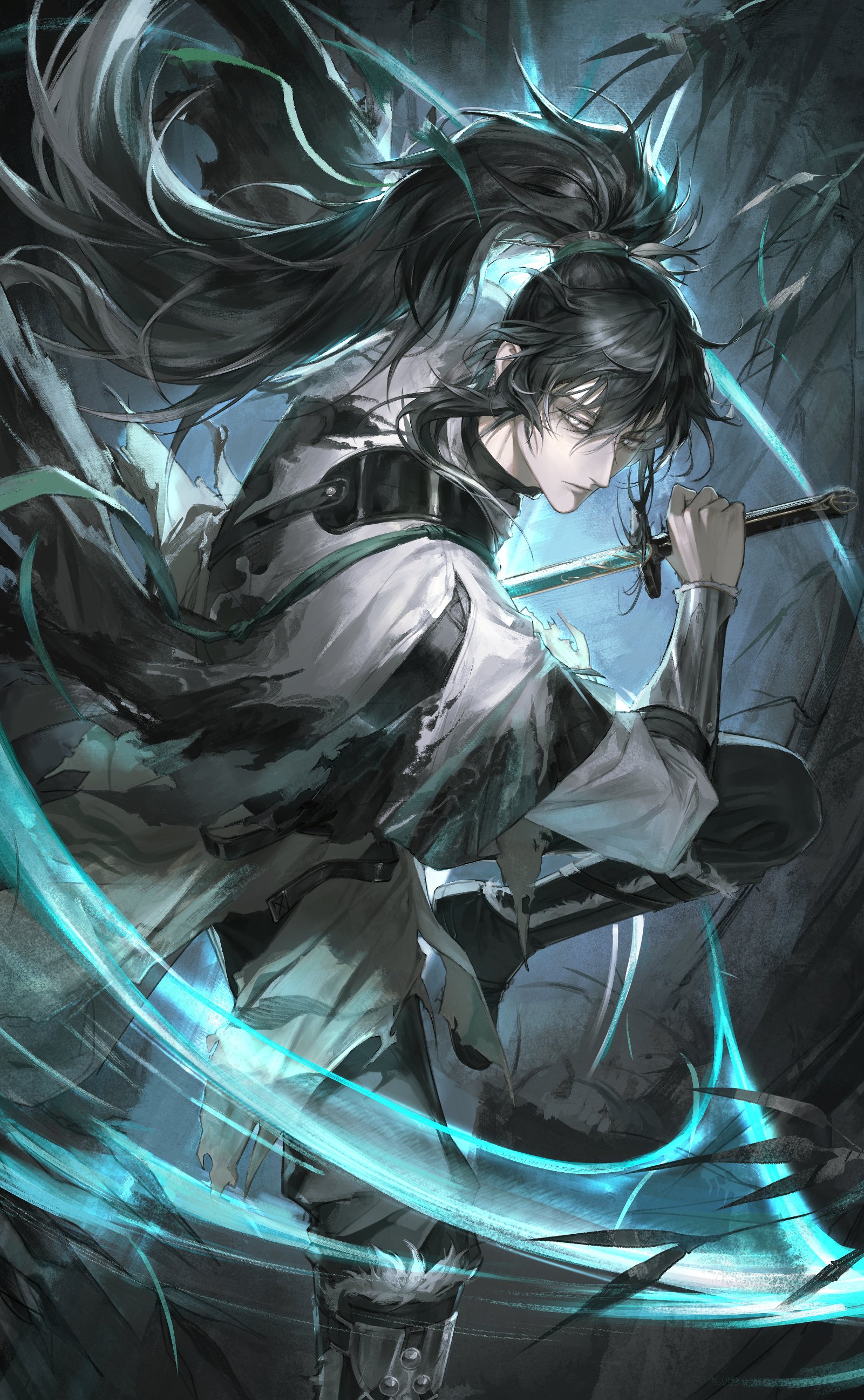 1boyarm upblack hairchinese clothesclosed mouthdrawing swordfloating clothesholdingholding swordholding weaponlong hairlong sleeveslooking to the sidemale focusponytailsideways glancesoloswordtorn clothesvery long hairweaponwhite eyes