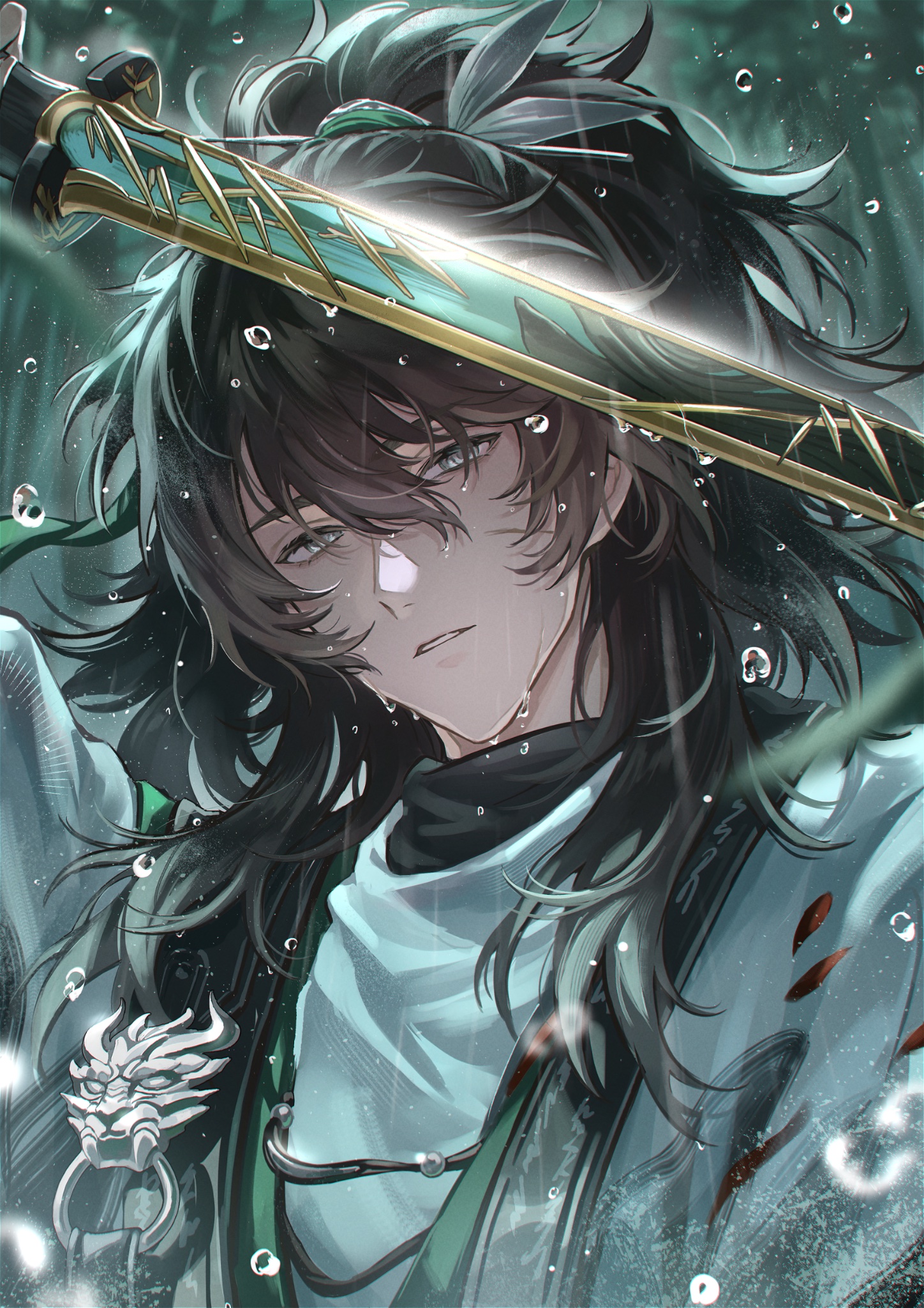 1boyarm upblack hairblack shirtchinese clotheshair between eyesholdingholding swordholding weaponlooking at viewermale focusparted lipsponytailportraitshirtsoloswordteethturtleneckwater dropweaponwetwet hairwhite shirt