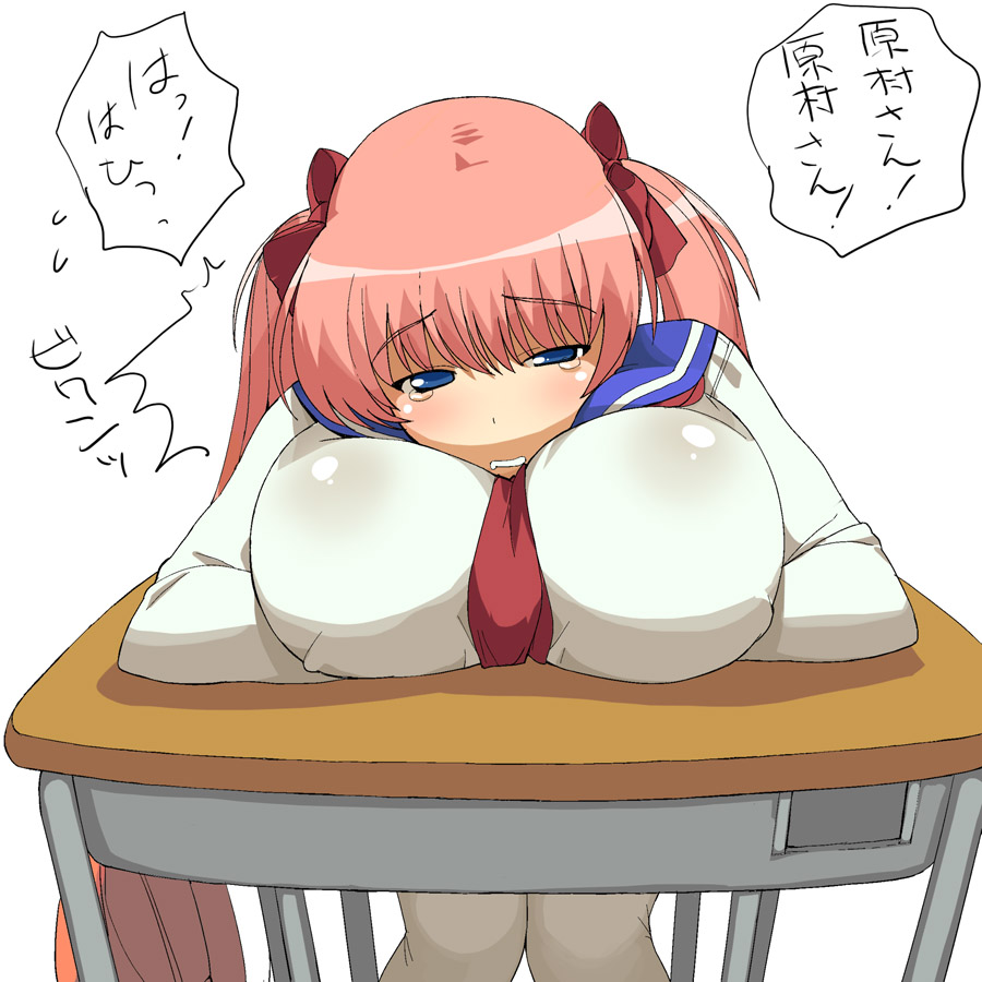 00s1girlblue eyesbreast pillowbreastsdeskfemale focushuge breastspink hairschool uniformself pillowsolotearstwintailswhite background