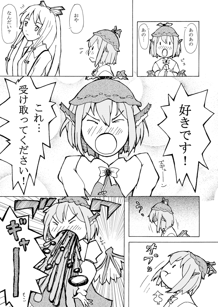 2girlsanimal earsbowcomicfemale focusgreyscalehair ribbonhatlong hairmonochromemultiple girlsparodyribbonshort hairvomitwings