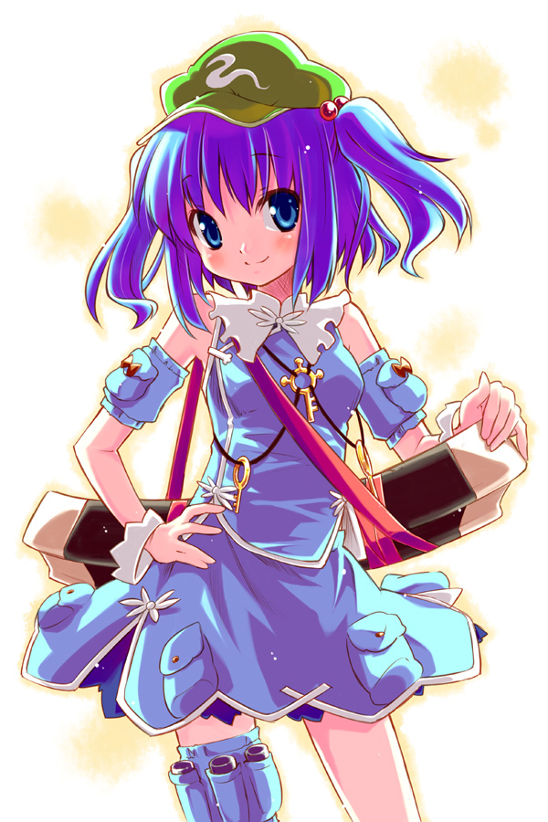 1girladapted costumebacklightingbare shouldersblue eyesblue hairdetached sleevesfemale focushair bobbleshair ornamenthand on own hiphathip focusholsterkeylooking at viewermatching hair/eyesshort hairsolothigh holsterthighhighstwintailstwo side up