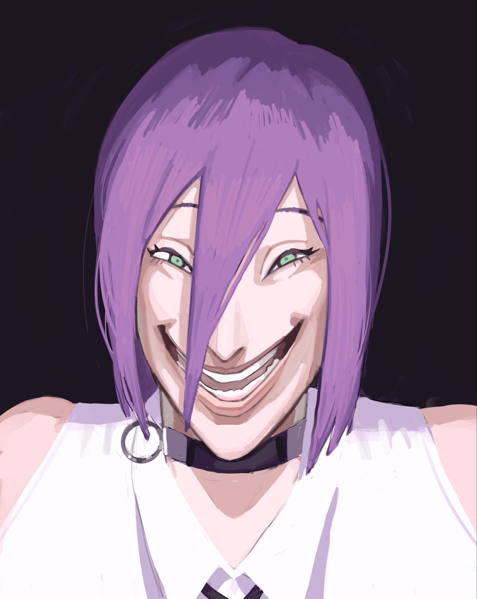 1girlblack backgroundblack hairchokerclose-upgreen eyesgrenade pingrinhair between eyeshair bunparodypull cordshirtskinny dippingsleevelesssleeveless shirtsmilesolo