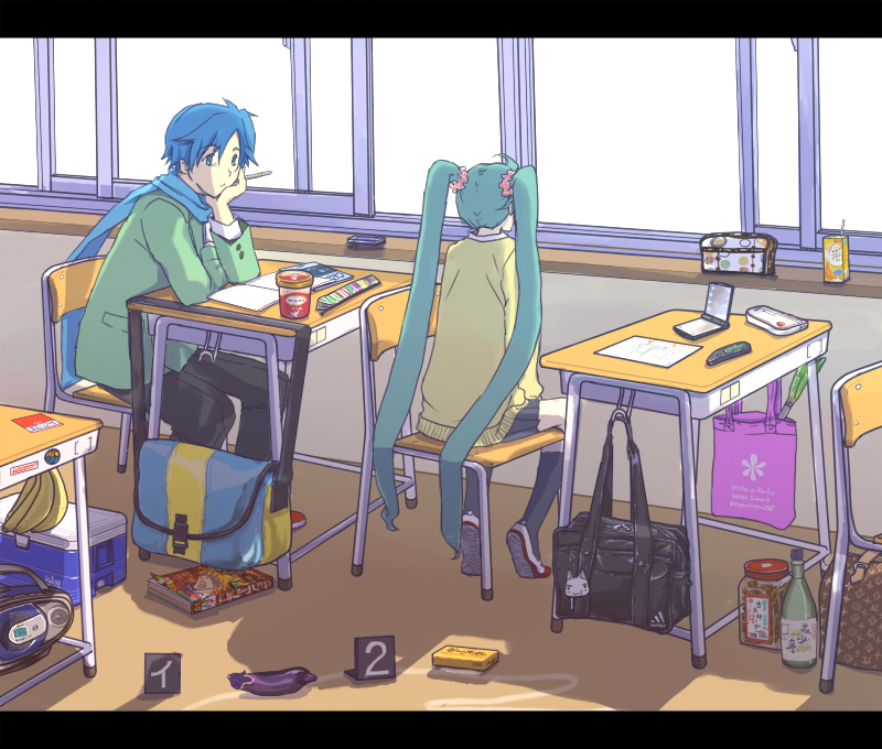 1boy1girlaqua hairbagbananablue eyesblue hairblue scarfbookbottleboxclassroomcomiccrime scenedeathdeskeggplantfoodfruithair ribbonice creamindoorsjuiceletterboxedlong hairmanga (object)murderpencilpencil caseradioribbonscarfschoolschool deskshoesskirtsocksspring onionthighhighstwintailsuwabakiwindow