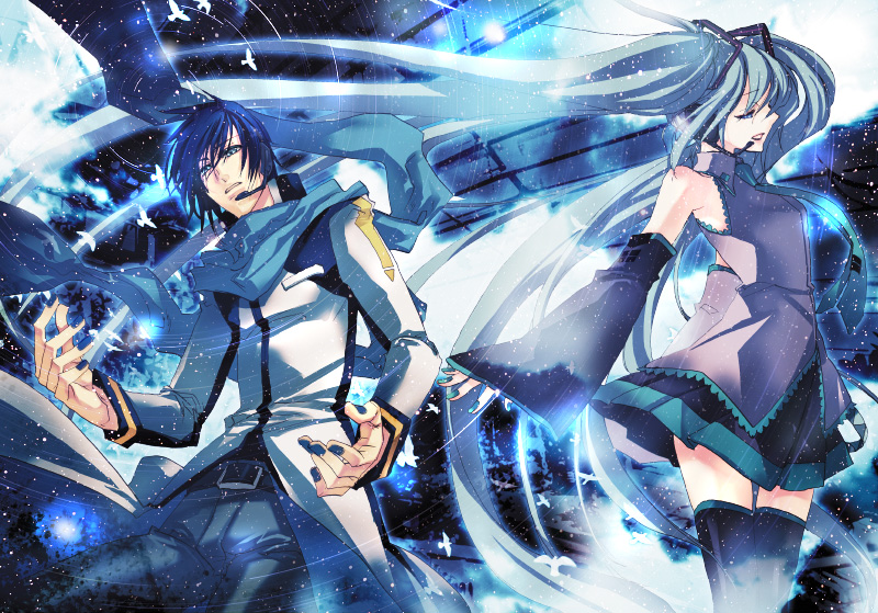 1boy1girlaqua hairaqua nailsbad anatomybad proportionsblue eyesblue hairblue scarfdetached sleeveslong hairnail polishnecktiepoorly drawnscarfskirtthighhighstwintailsvery long hairzettai ryouiki