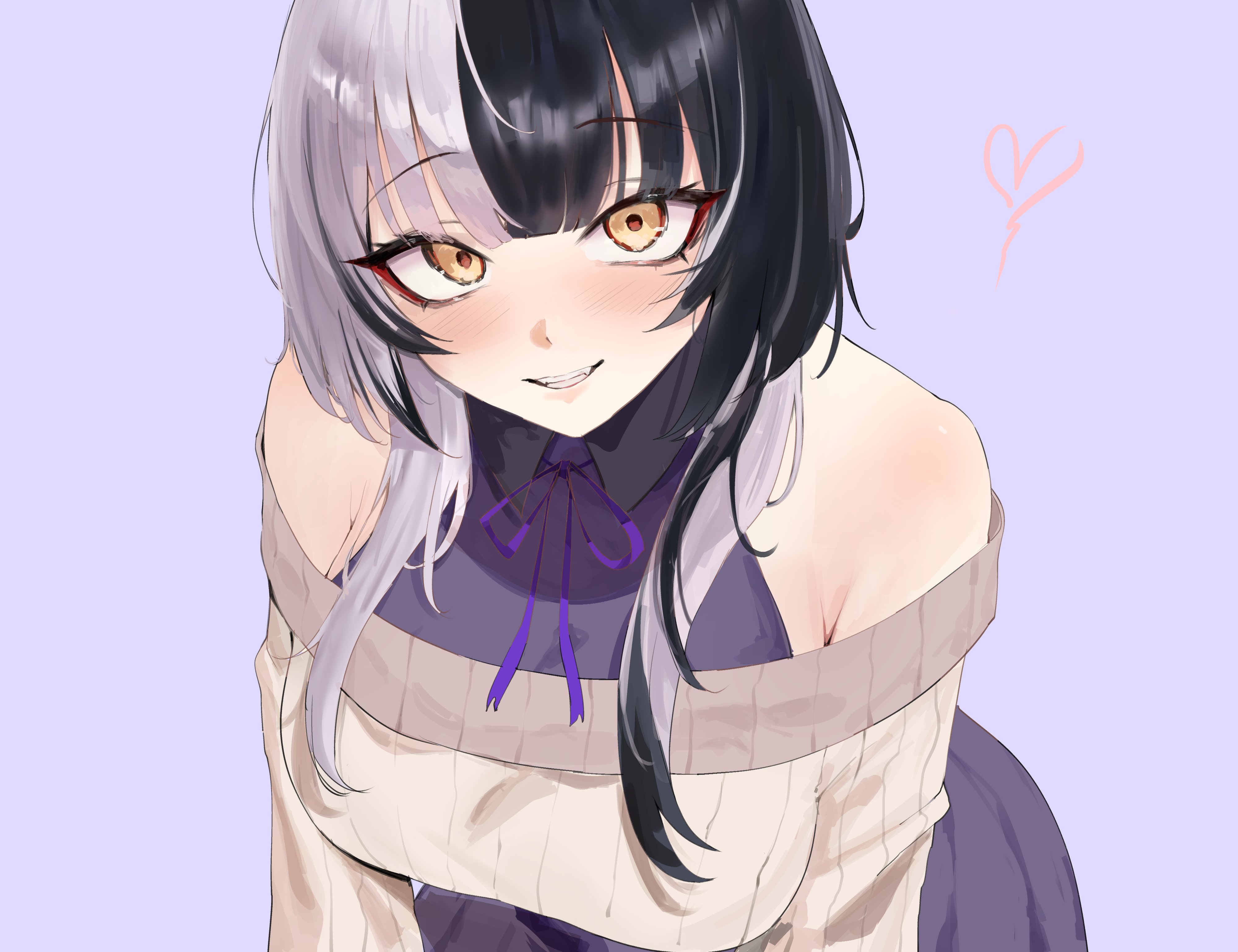 1girlalternate costumeblack hairbreastsgrey hairgrey sweaterheartlarge breastslong hairlooking at viewermulticolored hairpurple backgroundpurple shirtshirtsimple backgroundsleevelesssleeveless shirtsolosplit-color hairsweatertwo-tone hairvirtual youtuberyellow eyes