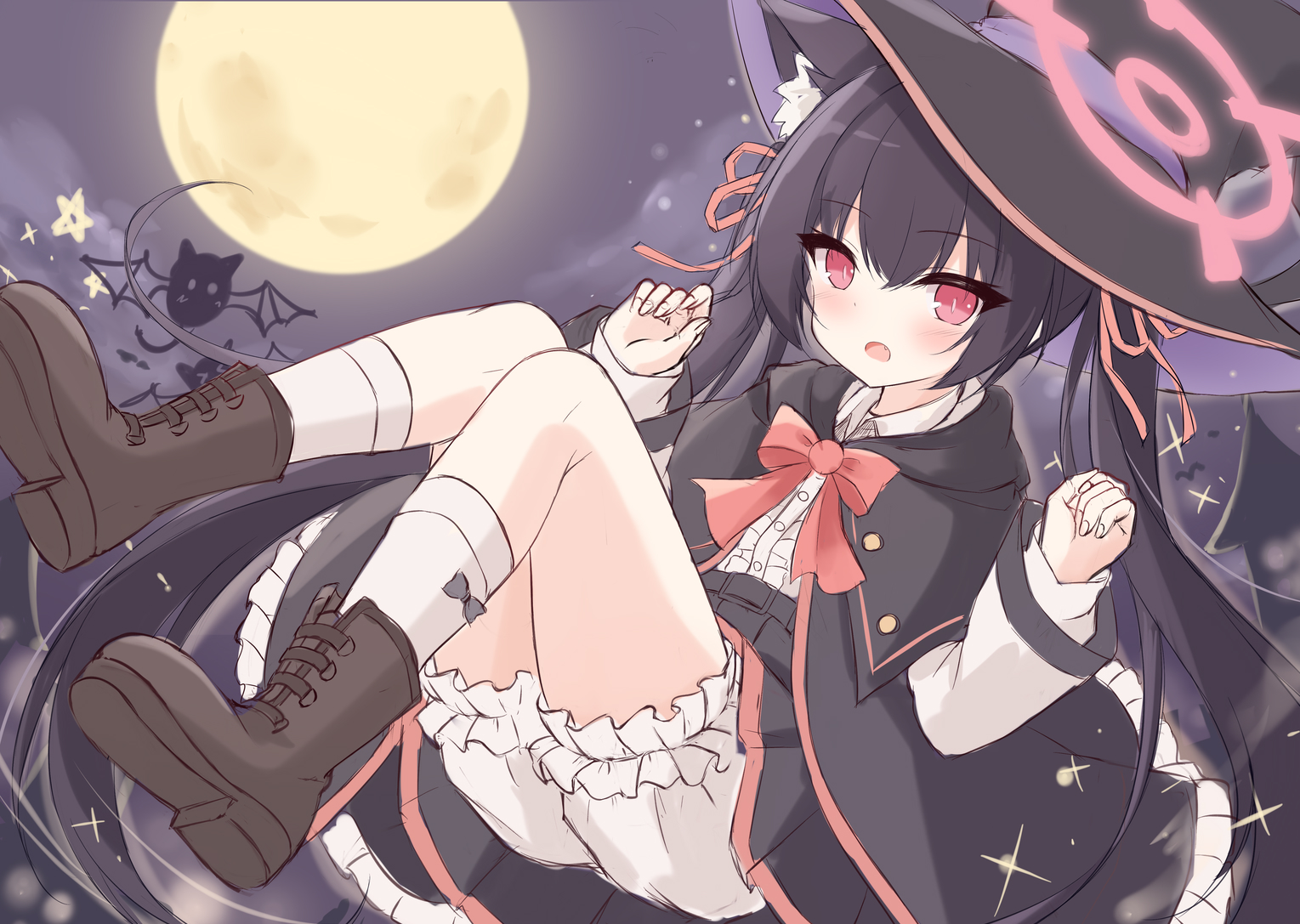 kanamafukana, asakura karen (heaven burns red), toujou tsukasa, heaven burns red, commentary, highres, 2girls, animal, animal on head, blonde hair, blue eyes, blue jacket, blush, bow, bowtie, braid, brown hair, cat, cat on head, cat tail, closed mouth, eye contact, hair ribbon, half up braid, hand on another's shoulder, hood, hood up, hoodie, jacket, long hair, long sleeves, looking at another, multiple girls, on head, orange hoodie, parted lips, red bow, red bowtie, ribbon, school uniform, simple background, smile, tail, white background, white ribbon, yuri