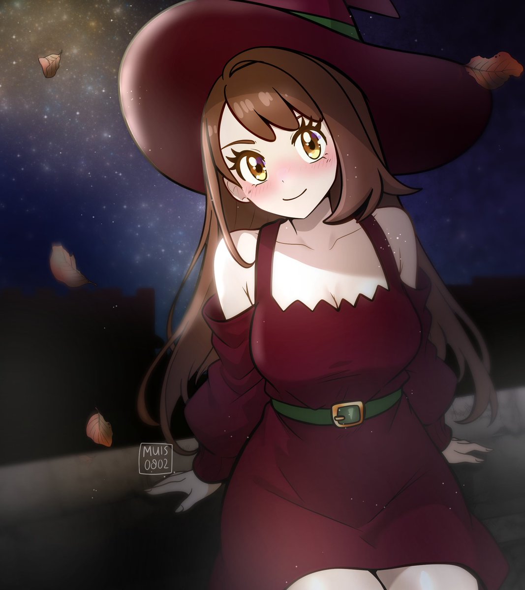 1girlalternate costumealternate hair lengthalternate hairstylearm supportbeltbreastsbrown eyesbrown haircleavageclosed mouthcollarbonedetached sleevesdresseyelashesfalling leavesgreen belthappyhatleaflong hairlong sleeveslooking at viewernightoutdoorssignaturesittingskysmilesolostar (sky)witch hat