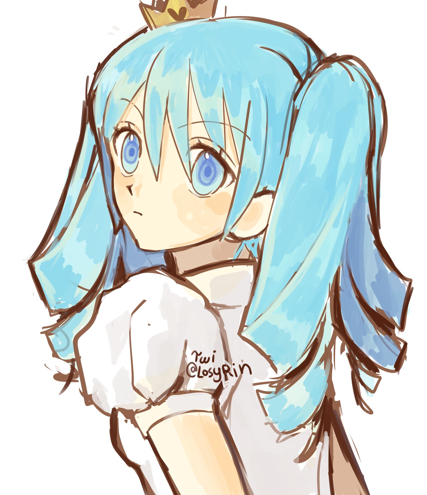 1girlaqua eyesaqua haircrowngold crownlight blushlooking to the sidelosyrinmini crownpuffy short sleevespuffy sleevesshirtshort sleevessoloturning headtwintailstwitter usernamewhite backgroundwhite shirt