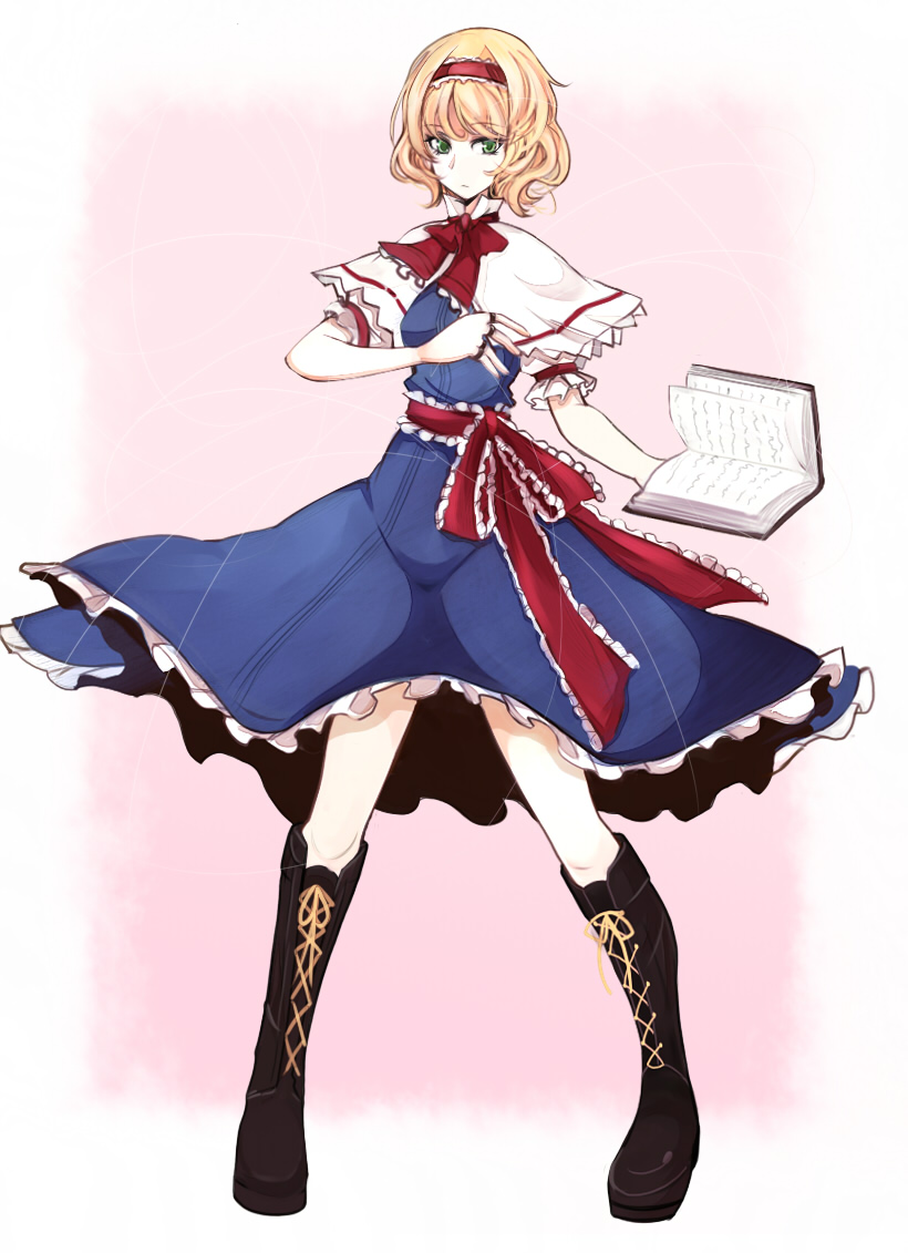 1girlblonde hairbookbootsclothes liftdressdress liftfemale focusfull bodygradient backgroundgreen eyeshairbandsolostring