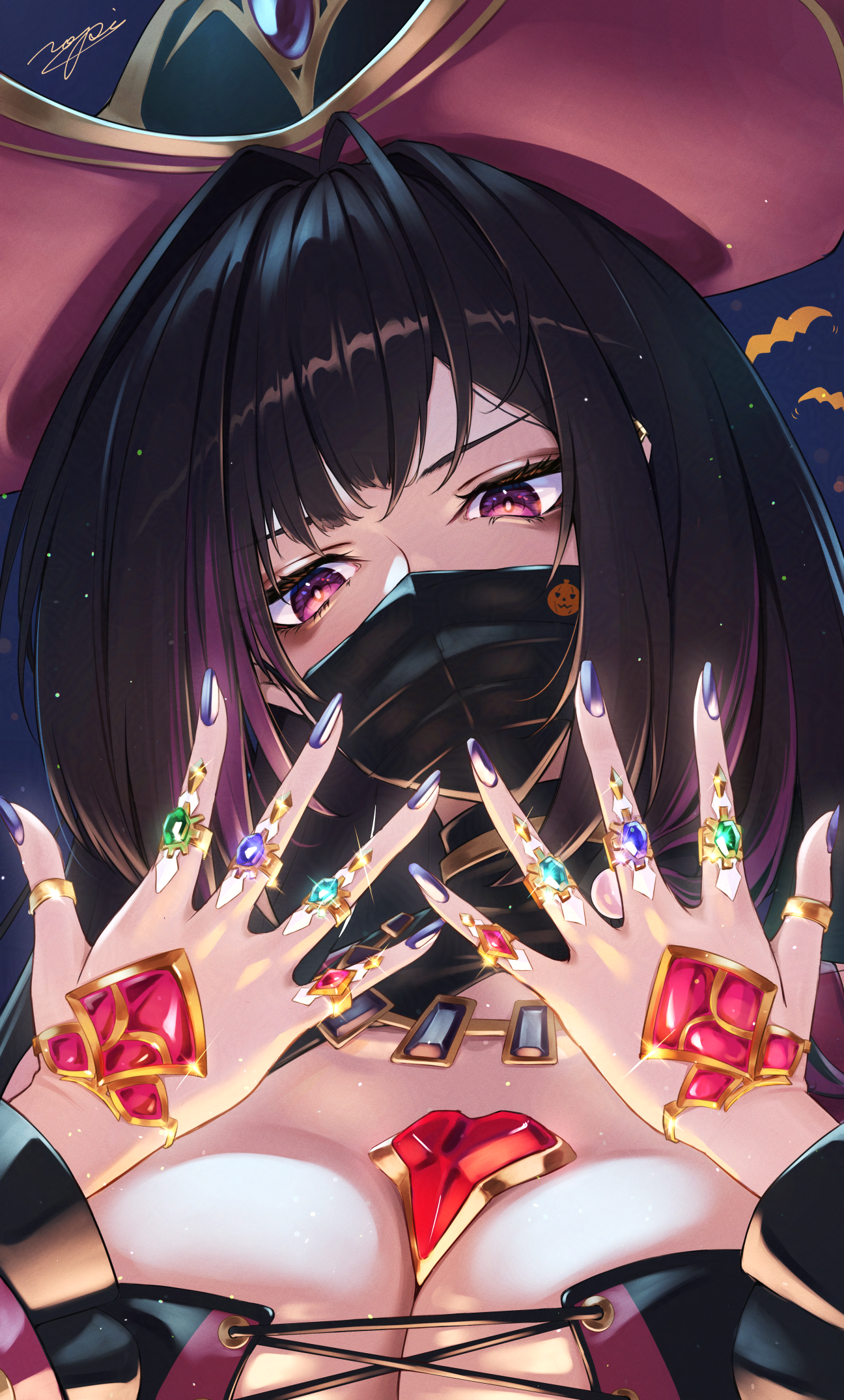 1girlbags under eyesblack hairblack maskblue gemstoneblue nailsbreastscleavagegemgold ringgreen gemstonehalloweenhatjewelrylarge breastsmaskmouth maskmulticolored hairnecklacepiratepirate hatpurple hairpurple streaksred eyesred gemstoneringsignaturesolostreaked hairupper body