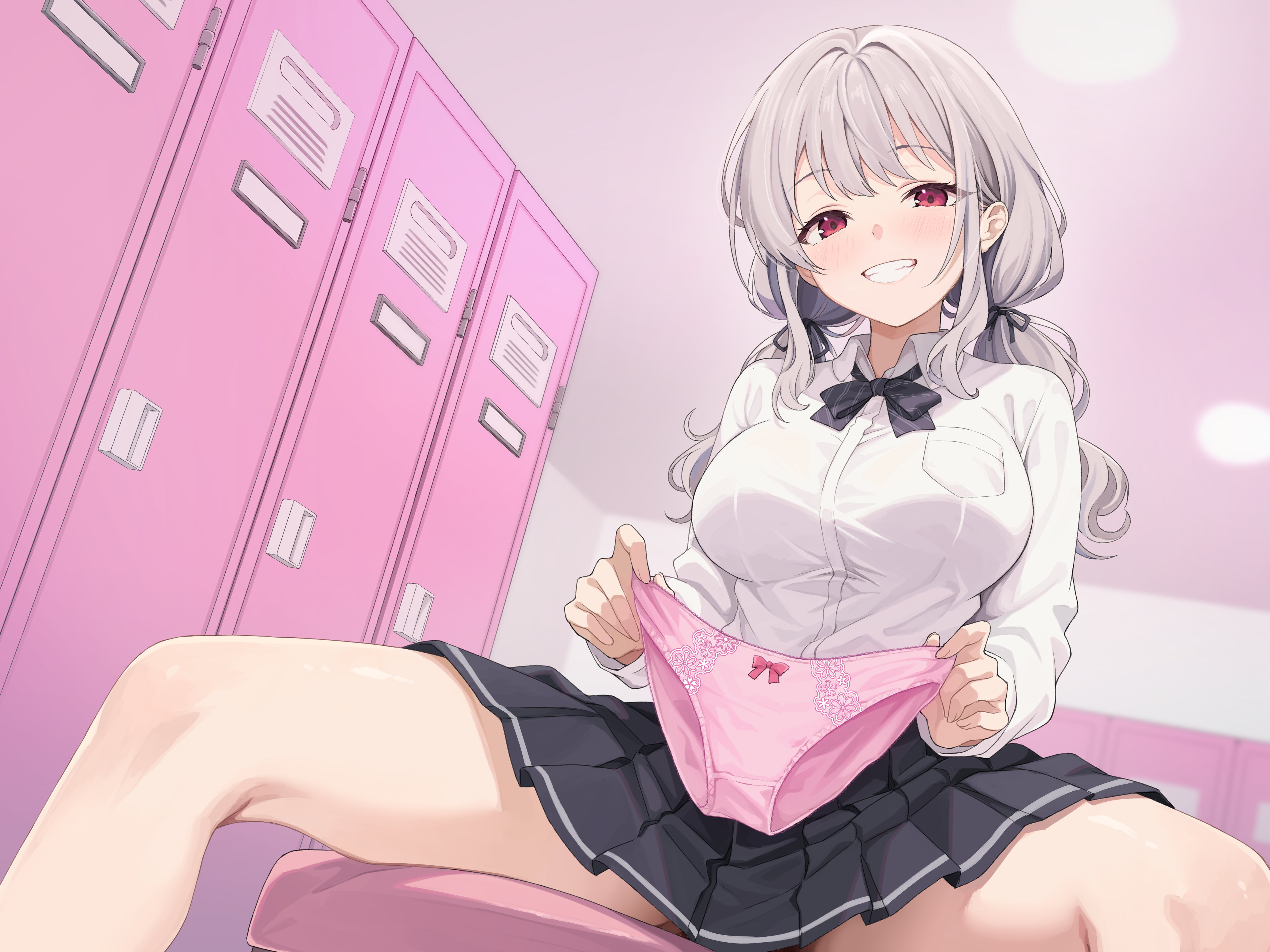 1girlbenchblack skirtblushbowbow pantiesbreastsceilingcollared shirtgrey hairgrinholdingholding pantiesholding underwearholding unworn clothesindoorslockerlocker roomlong hairlong sleeveslooking at viewermedium breastspantiespink pantiespleated skirtred eyesschool uniformshirtsidelockssittingskirtsmilesolospread legsteeththighsunderwearunworn pantieswhite shirt