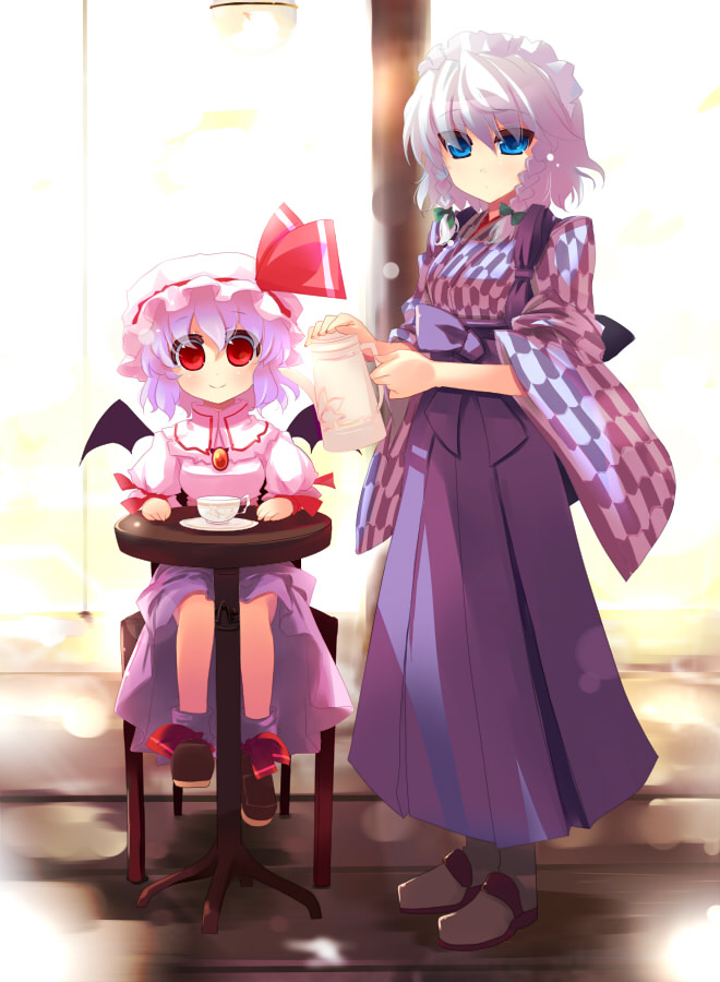 2girlsbat wingsblue eyesblue hairbraidcupfemale focushairbandhatjapanese clothesmultiple girlsred eyesshort hairteacupteapottwin braidswingsyagasuri