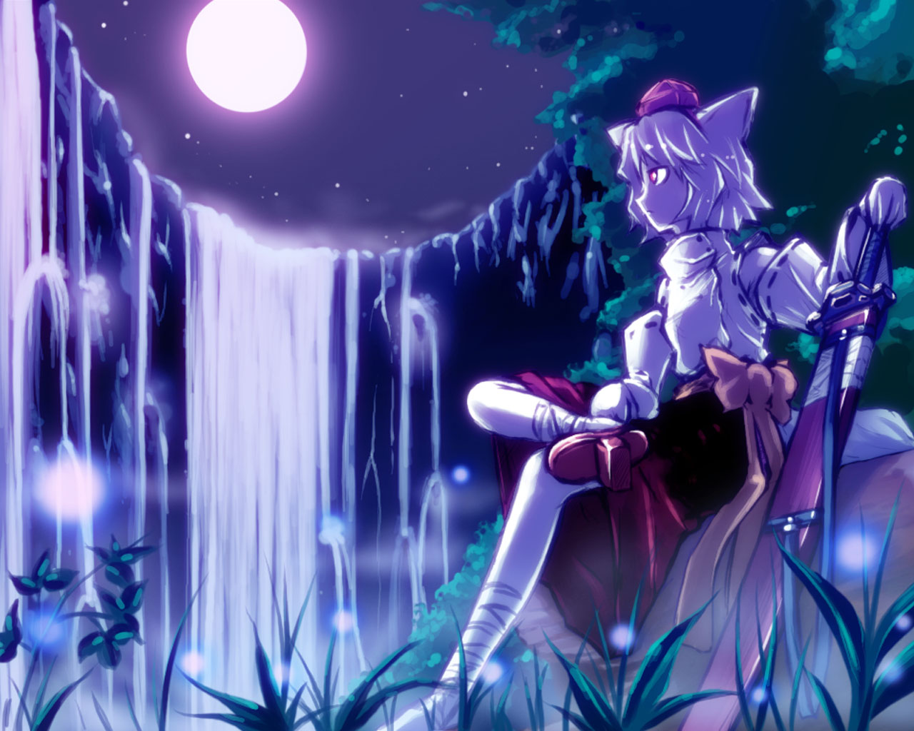 1girlanimal earscrossed legsfemale focusfigure four sittinggetahatmoonnaturenightoutdoorssittingskysoloswordtengu-getatokin hatwaterwaterfallweaponwolf ears