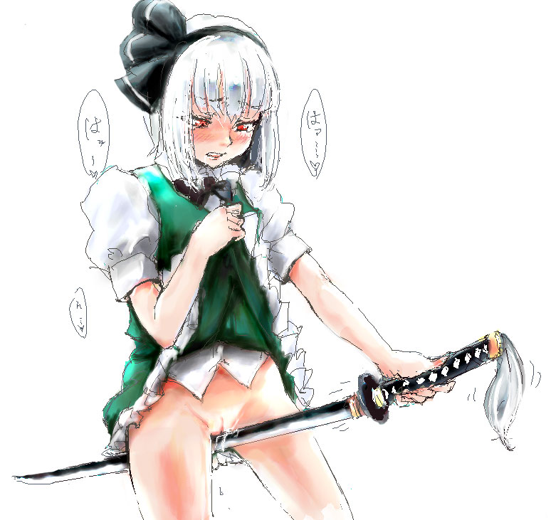 1girlblushbottomlessclothes liftcrotch rubdressdress liftfemale focusfemale masturbationhair ribbonkatanamasturbationno pantiespussypussy juicered eyesribbonsalivasimple backgroundskirtskirt liftsoloswordweaponwhite backgroundwhite hair