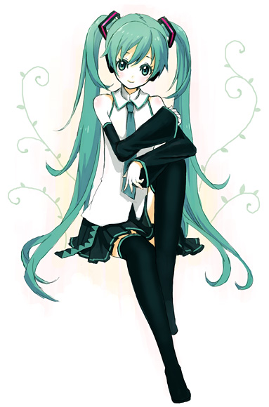 bare shouldersblack thighhighsdetached sleevesgreen eyesgreen hairlong hairsimple backgroundsittingsmilesolothighhighstwintailsvery long hair
