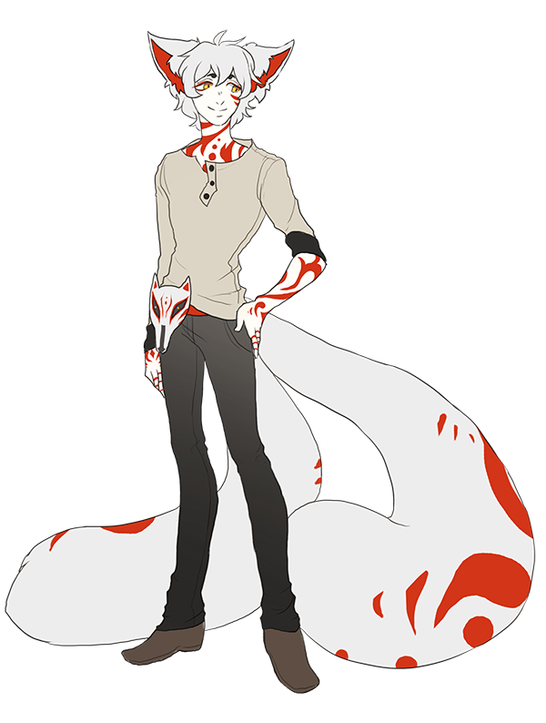1boyahogeanimal earsfox boyfox earsfox maskfox tailfull bodyfull-body tattoogrey shirthand on own hipkemonomimi modelooking to the sidemale focusmaskmask on beltmultiple tailsshirtshort hairsmilesolostandingtailtattootwo tailswhite hairyellow eyes