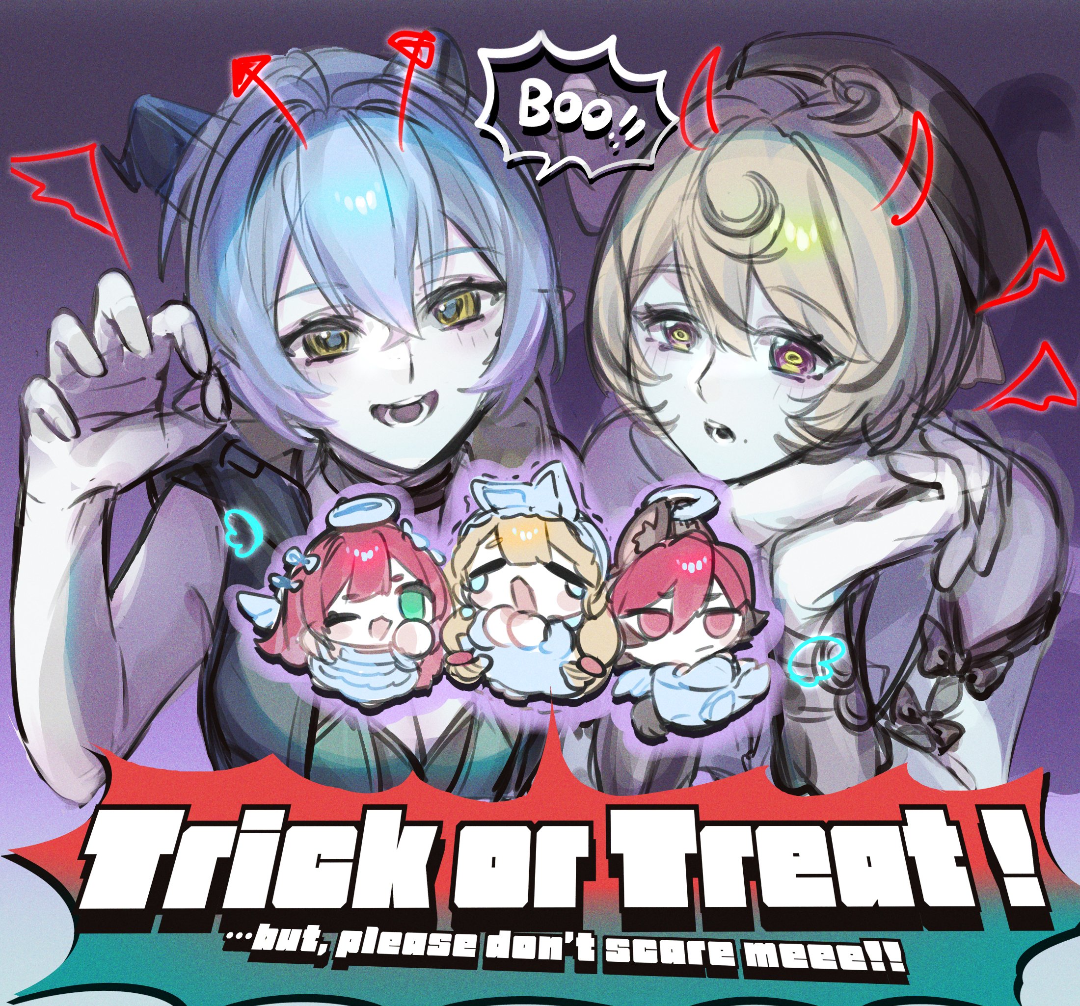 1boy4girlsalternate costumeanimal ear fluffanimal earsbare shouldersblack bowblack hatblonde hairblue hairblue hornsblushbowbrown hairbrown tailchibiclaw posecollarcrossed armsdemon hornsdog boydog earsdog taildrawn hornsdrawn wingsdressenglish textgoat earsgoat girlgoat hornsgreen eyeshair between eyeshair bowhalf-closed eyeshalohathorizontal pupilshornslayered dresslong hairlooking at anotherlooking at viewerlow twintailsmolemole under mouthmonster girlmulticolored hairmultiple girlsone eye closedopen mouthown hands togetherpointy earspurple backgroundpurple eyesrabbit earsrabbit girlred eyesred hairshirtshort hairspeech bubbletailtearstentacle girltentacle tailtentaclestremblingtwintailsupper bodyvvo uvvwhite bowwhite dresswhite halowhite headdresswhite shirtyellow eyes