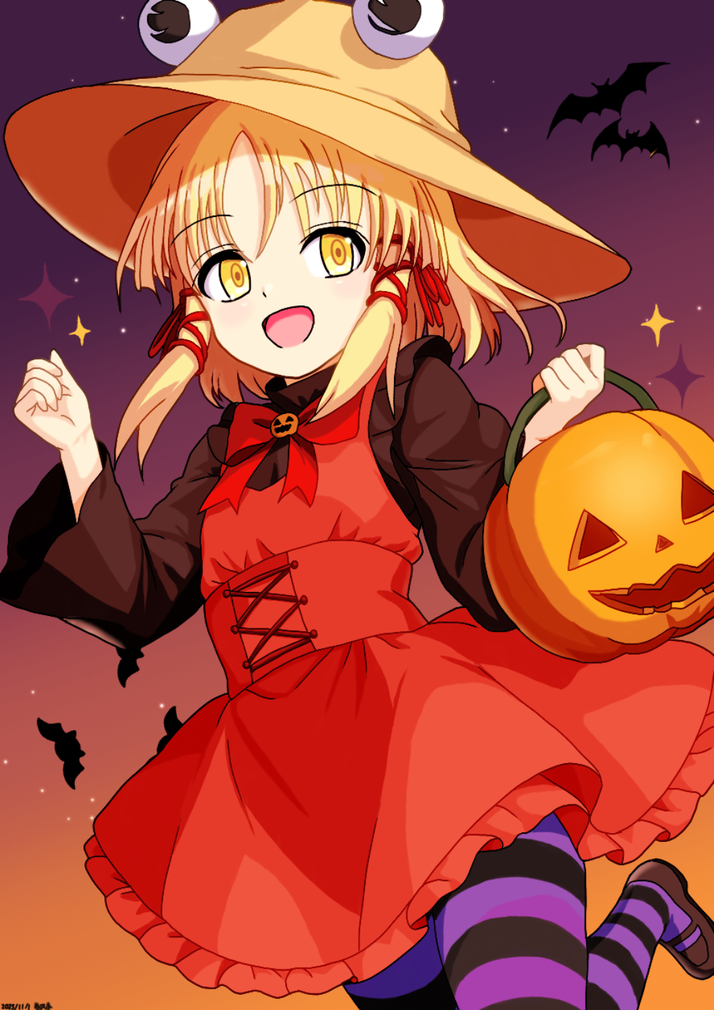 1girlalternate costumebat (animal)black pantyhoseblack shoesblonde hairbowbowtiebrown hatdateddresshair ribbonhalloweenhalloween costumehatjack-o'-lanternlong hairlong sleeveslooking at vieweropen mouthpantyhosepurple pantyhosered bowred bowtiered dressred ribbonribbonshoessmilesolostriped clothesstriped pantyhosetress ribbontwo-tone pantyhosewide sleevesyellow eyes