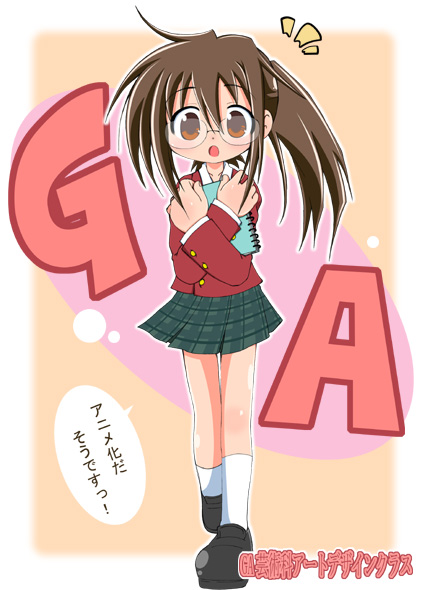 00sannouncement celebrationbrown eyesbrown hairglasseslong hairnotebookopen mouthplaid clothesplaid skirtponytailschool uniformskirtsockssolo