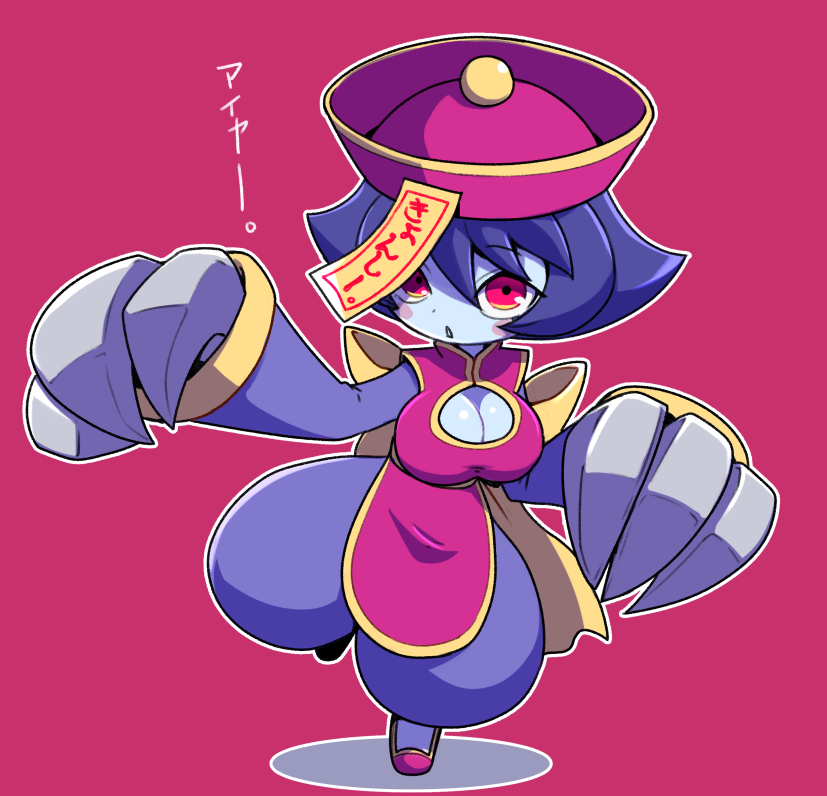1girlback bowbaggy pantsblue hairblue pantsblue skinblush stickersbowbreastschibichibi onlyclaw (weapon)cleavagecleavage cutoutclothing cutoutcolored skinfighting stancefull bodyhands uphatjiangshilong sleeveslooking at viewermedium breastsofudaopen mouthoutlinepantsqingdai guanmaored backgroundred eyesred hatred shoesshoesshort hairsolostandingstanding on one legweaponwhite outline