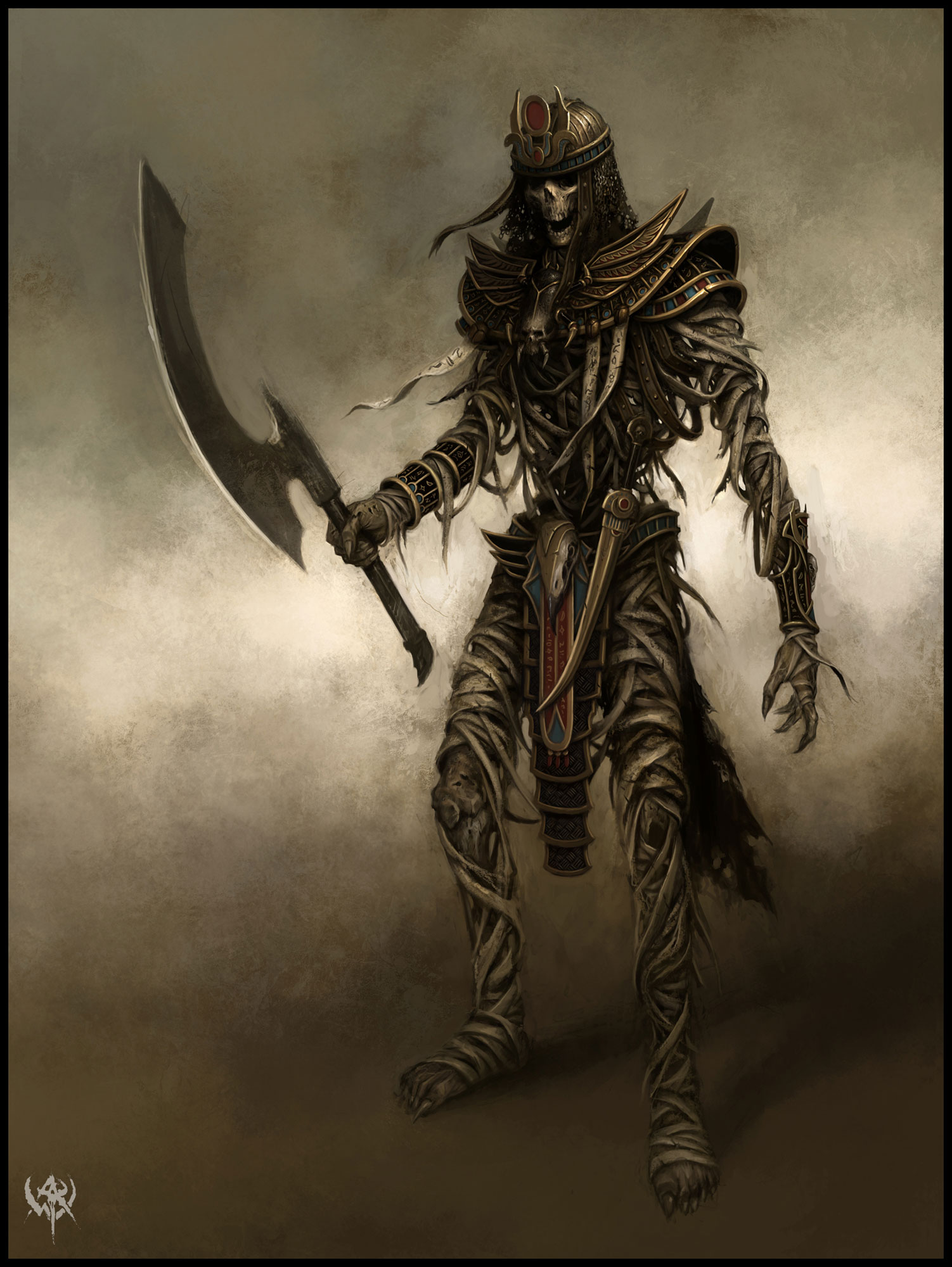 ancient egyptianarmorbandagesblack borderborderfantasyhelmetholdingholding weaponkopeshmummyskeletonstandingswordtomb kingsundeadwarhammerweapon