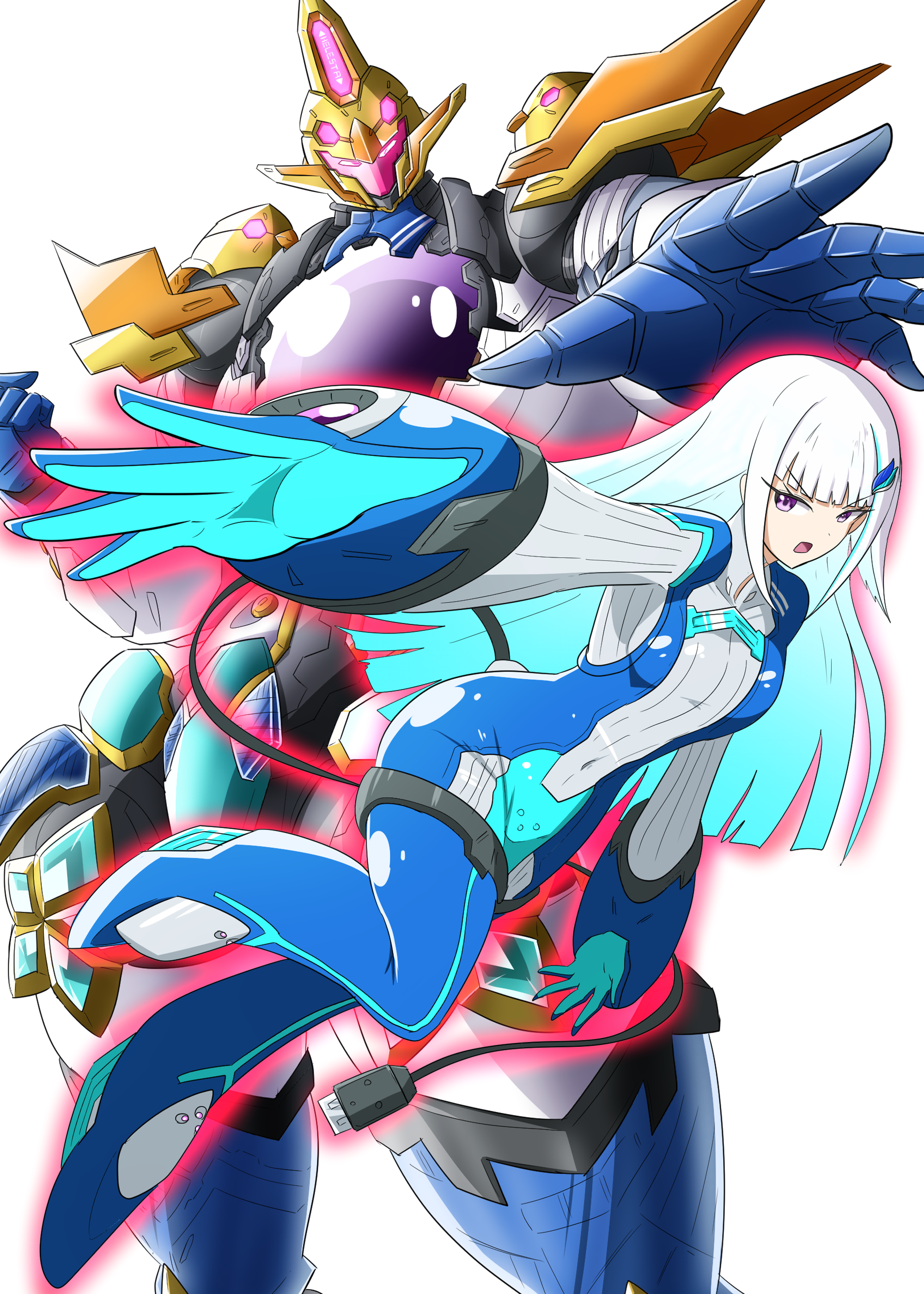 1girlalternate costumeblue bodysuitblue hairblunt bangsbodysuitbreastscablecable tailcolored inner haircovered navelforeshorteningglowingglowing eyeshair ornamenthand upleg uplong hairlooking at viewerlooking to the sidemechamecha pilot suitmechanical tailmulticolored hairopen mouthpurple eyesreachingreaching towards viewerrobotsidelockssimple backgroundsmall breastsstreaked hairtailtwo-tone hairv-shaped eyebrowsvery long hairvirtual youtuberwhite backgroundwhite hair