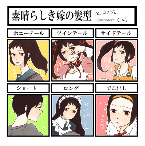 1girlalternate hairstylecosplayforeheadgenderswapgenderswap (mtf)hairbandlong hairmultiple viewsponytailshort hairtwintailswaitress