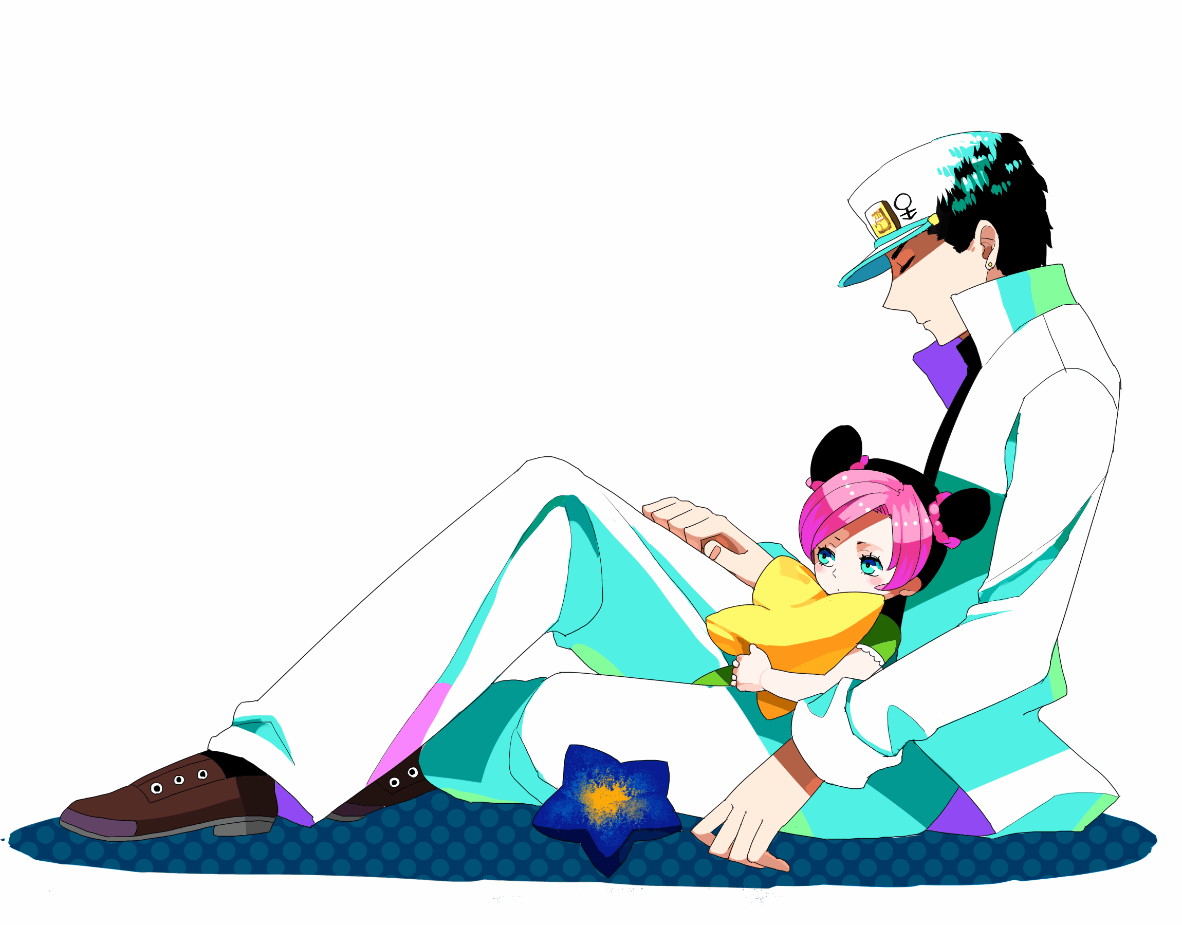 1boy1girlage differenceaged downblack hairblue eyesclosed eyesdouble bunearringsfather and daughterfrom sidefull bodyhair bunhatjewelrylong coatmulticolored hairpantspink hairshoessimple backgroundsittingstar (symbol)stuffed toywhite background